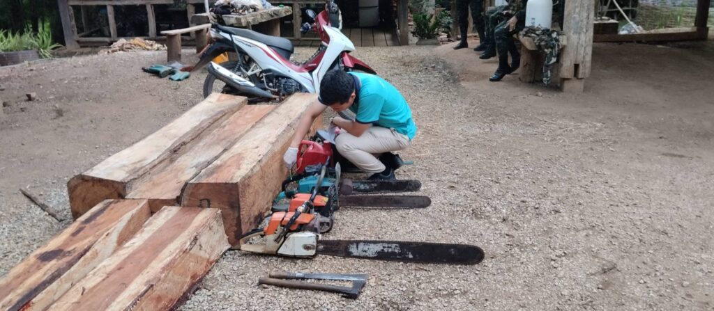 ทั้งนี้ขณะลาดตระเวนถึงบริเวณป่าดังกล่าว พบชายกลุ่มหนึ่งกำลังใช้เลื่อยโซ่ยนต์แปรรูปไม้ จึงได้แสดงตนและร่วมกันเข้าทำการจับกุม พบว่า กลุ่มผู้ต้องหาพยามหลบหนี โดยสามารถจับกุมได้ 2 คน ส่วนชายที่เหลือได้อาศัยความชำนาญในพื้นที่วิ่งหลบหนีไปได้ จากการสอบถามผู้กระทำผิดทั้ง 2 คน ได้ให้ถ้อยคำว่า ชายที่วิ่งหลบหนีไปได้มี 4 คน ซึ่งเป็นราษฎรหมู่บ้านเดียวกัน ถ้าหากพบเห็นสามารถชี้ตัวรูปพรรณสันฐานได้