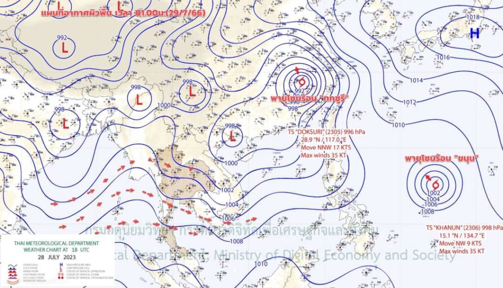 นางสาวชมภารี ชมภูรัตน์ อธิบดีกรมอุตุนิยมวิทยากล่าว่า ตั้งแต่วันที่ 29 ก.ค. – 3 ส.ค. หลังจากพายุไต้ฝุ่น “ทกซูรี” สลายตัวไปแล้ว ฝนจะเริ่มกลับมาตกกระจายอีกครั้งบริเวณภาคเหนือ ภาคตะวันออกเฉียงเหนือตอนบนและด้านตะวันออก ภาคกลางด้านตะวันตก ภาคตะวันออกด้านรับมรสุมที่จังหวัดจันทบุรีและตราด ภาคใต้ฝั่งอันดามันที่จังหวัดระนองและพังงา ส่วน กทม. และปริมณฑล จะเริ่มมีฝนช่วงบ่าย-ค่ำ ส่วนใหญ่ยังเป็นฝนเล็กน้อยถึงปานกลาง