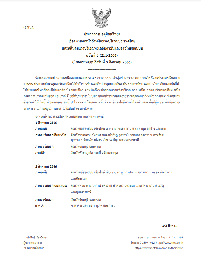 ว่าที่ร้อยตรี ธนะสิทธิ์ เอี่ยมอนันชัย รองอธิบดีกรมอุตุนิยมวิทยากล่าวว่า ได้ออกประกาศกรมอุตุนิยมวิทยาเรื่อง ฝนตกหนักถึงหนักมากบริเวณประเทศไทยและคลื่นลมแรงบริเวณทะเลอันดามันและอ่าวไทยตอนบนเนื่องจากร่องมรสุมพาดผ่านภาคเหนือตอนบนและประเทศลาวตอนบน เข้าสู่หย่อมความกดอากาศต่ำบริเวณประเทศเวียดนามตอนบน ประกอบกับมรสุมตะวันตกเฉียงใต้กำลังค่อนข้างแรงพัดปกคลุมทะเลอันดามัน ประเทศไทย และอ่าวไทย ทำให้ประเทศไทยยังคงมีฝนตกต่อเนื่องและมีฝนตกหนักถึงหนักมากบางแห่งทุกภาครวม 40 จังหวัด จนถึงวันที่ 3 สิงหาคม ดังนี้