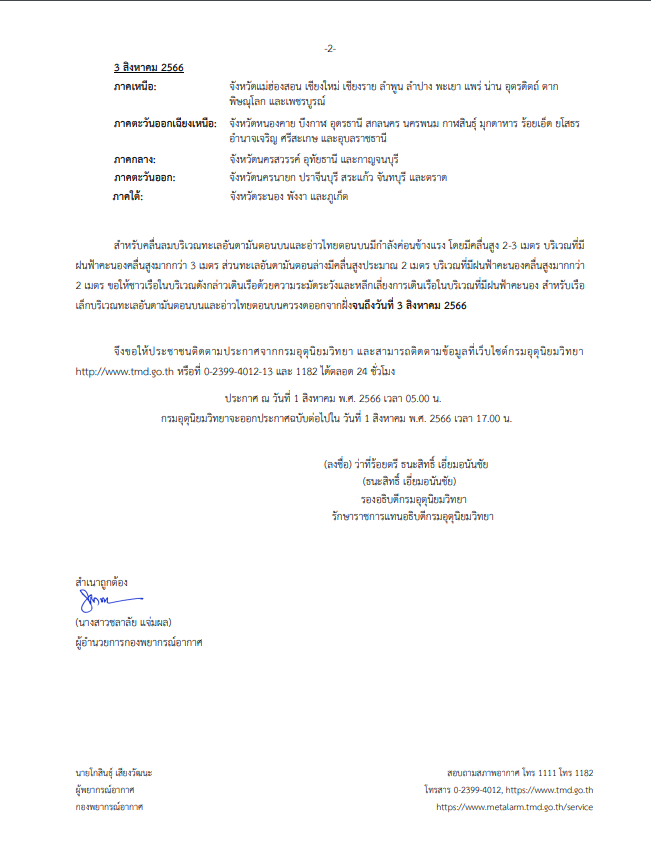 สำหรับคลื่นลมบริเวณทะเลอันดามันตอนบนและอ่าวไทยตอนบนมีกำลังค่อนข้างแรง โดยมีคลื่นสูง 2-3 เมตร บริเวณที่มีฝนฟ้าคะนองคลื่นสูงมากกว่า 3 เมตร ส่วนทะเลอันดามันตอนล่างมีคลื่นสูงประมาณ 2 เมตร บริเวณที่มีฝนฟ้าคะนองคลื่นสูงมากกว่า 2 เมตร ขอให้ชาวเรือในบริเวณดังกล่าวเดินเรือด้วยความระมัดระวังและหลีกเลี่ยงการเดินเรือในบริเวณที่มีฝนฟ้าคะนอง สำหรับเรือเล็กบริเวณทะเลอันดามันตอนบนและอ่าวไทยตอนบนควรงดออกจากฝั่งจนถึงวันที่ 3 สิงหาคม 2566