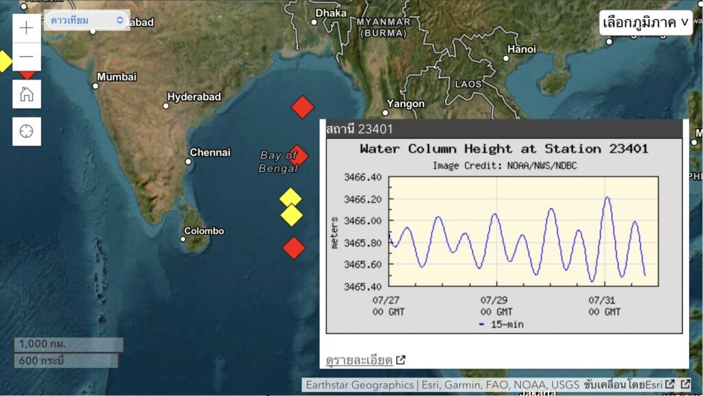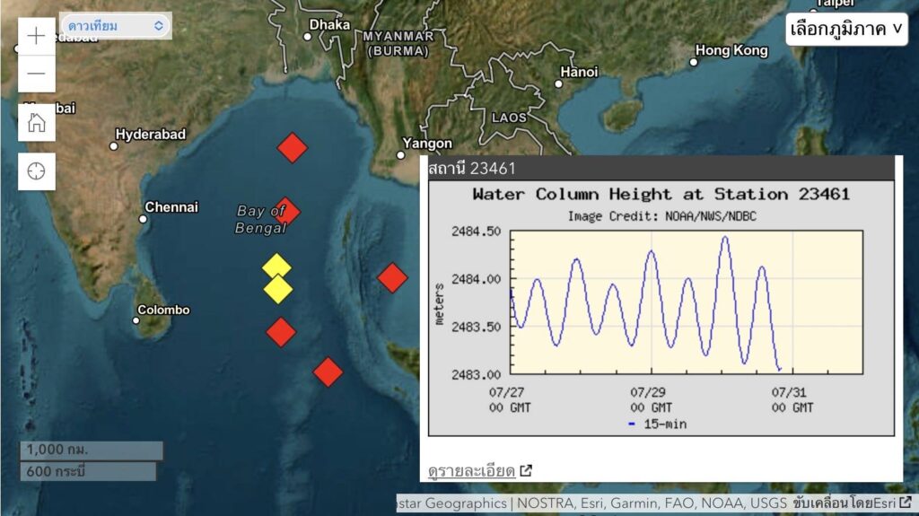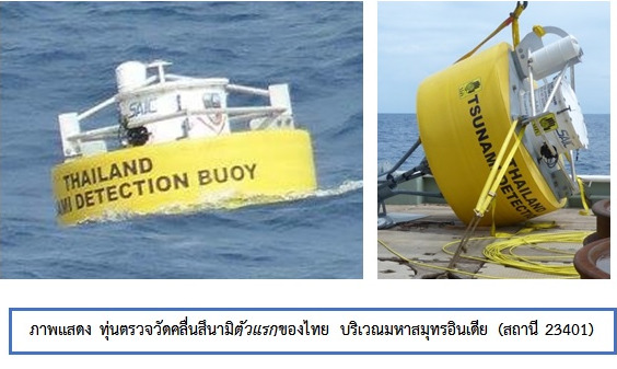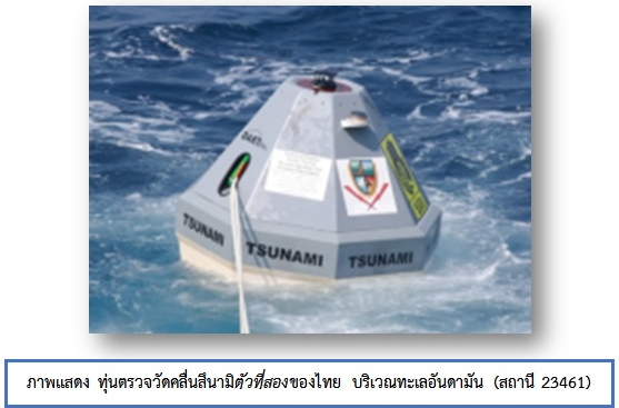 ทั้งนี้ศูนย์เตือนภัยพิบัติแห่งชาติ (ศภช.) ปภ. ติดตั้งทุ่นตรวจวัดคลื่นสึนามิ 2 ทุ่นได้แก่ ทุ่นตรวจวัดคลื่นสึนามิในทะเลอันดามัน สถานี 23461 ติดตั้งห่างจากเกาะภูเก็ตประมาณ 340 กิโลเมตรหรือเรียกว่า ทุ่นตัวใกล้ซึ่งหลุดจากตำแหน่งดังกล่าว ส่วนทุ่นอีกตัวติดตั้งในมหาสมุทรอินเดียที่สถานี 23401 หรือเรียกว่า ทุ่นตัวไกล ห่างจากเกาะภูเก็ตไปทางทิศตะวันตกเป็นระยะทาง 965 กิโลเมตร โดยทุ่นตัวไกลนี้ยังทำงานเป็นปกติ พร้อมยืนยันว่า บำรุงรักษาทุ่นตรวจวัดคลื่นสึนามิอย่างต่อเนื่องเป็นประจำทุก 2 ปีตามมาตรฐานการบำรุงรักษาขององค์การบริหารสมุทรศาสตร์และบรรยากาศแห่งชาติ (NOAA)