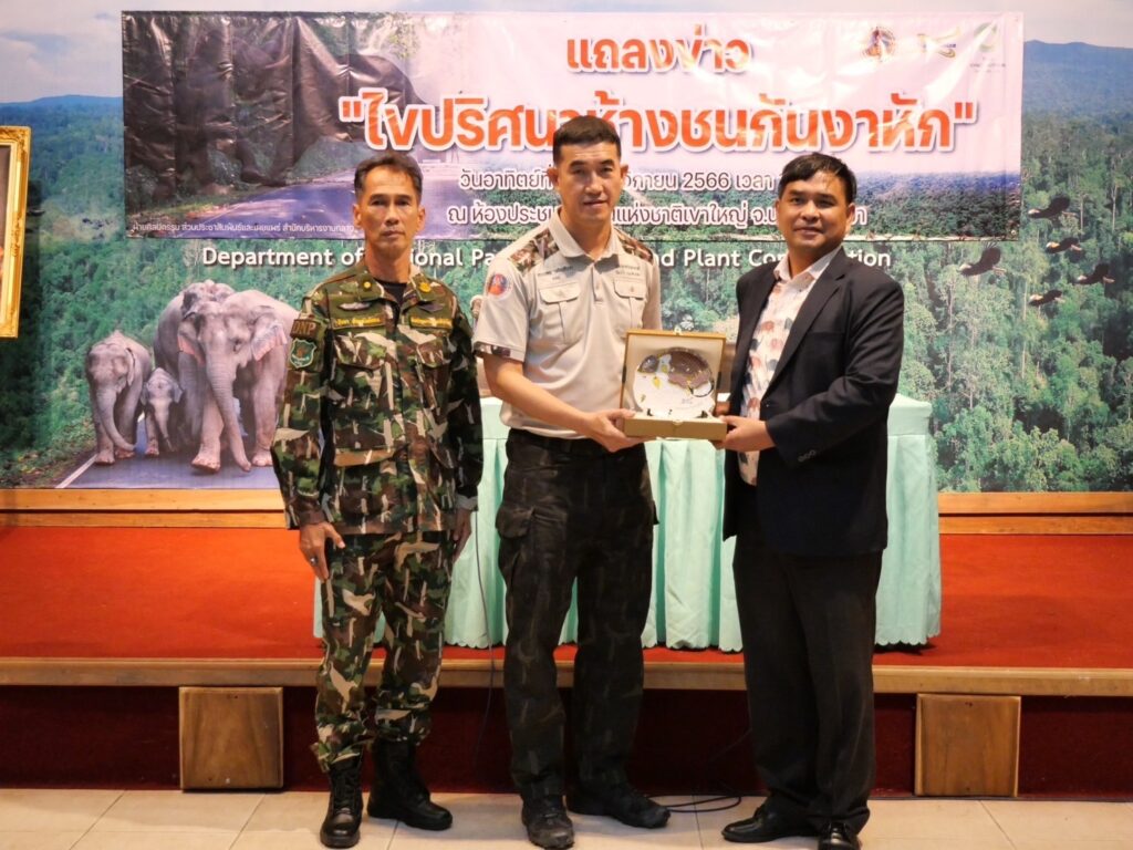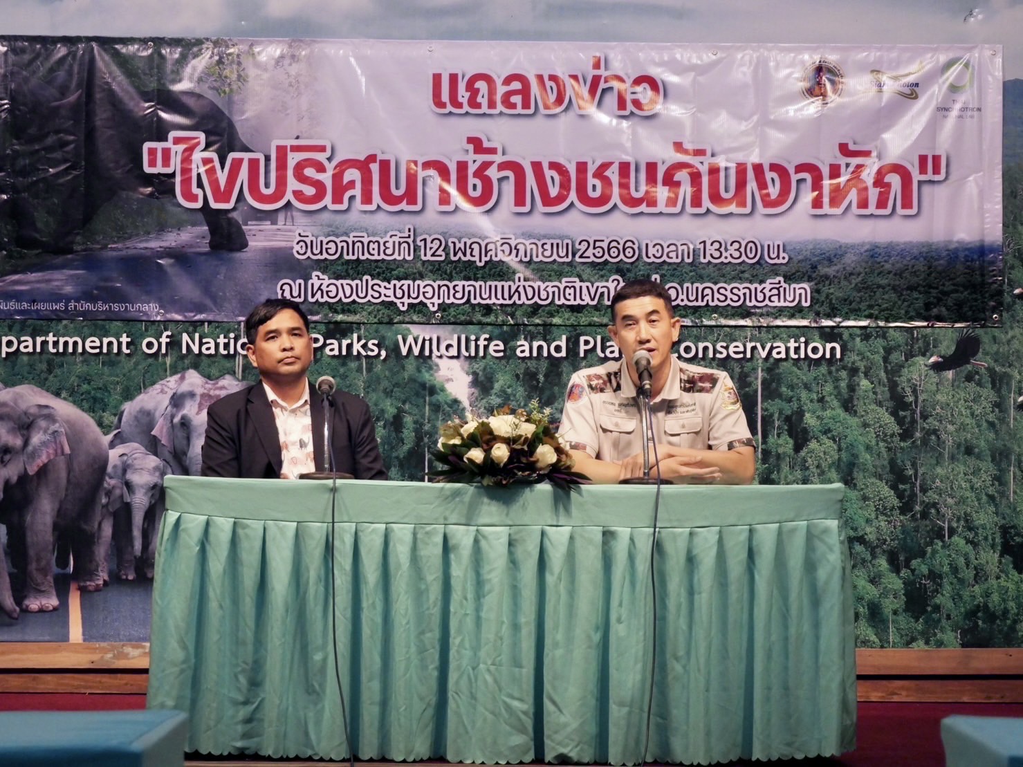 นายอรรถพล เจริญชันษา อธิบดีกรมทรัพยากรทางทะเลและชายฝั่ง รักษาราชการแทนอธิบดีกรมอุทยานแห่งชาติ สัตว์ป่า และพันธุ์พืช และ รศ.ดร.สาโรช รุจิรวรรธน์ ผู้อำนวยการสถาบันวิจัยแสงซินโครตรอน ร่วมแถลงข่าว “ไขปริศนาช้างชนกันงาหัก” ณ อุทยานแห่งชาติเขาใหญ่ จังหวัดนครราชสีมา