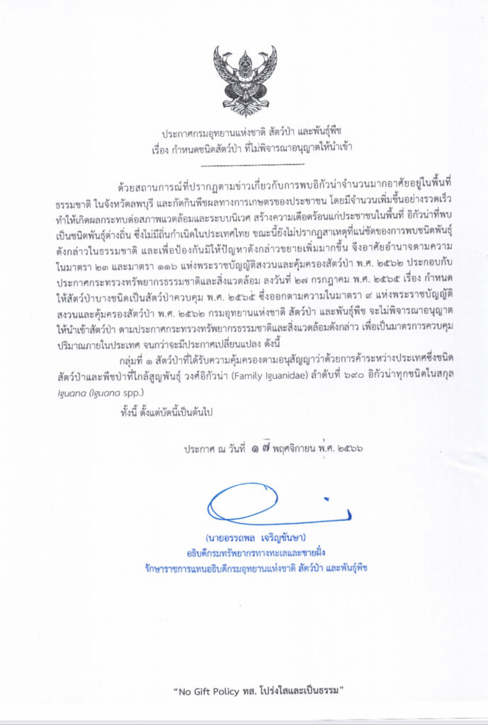 กรุงเทพฯ 20 พ.ย. – กรมอุทยานฯ ออกประกาศห้ามนำเข้า “อิกัวนา” และสัตว์ในวงศ์เดียวกันทุกชนิดเพื่อควบคุมประชากรเนื่องจากหลุดออกสู่ธรรมชาติ แล้วแพร่ขยายพันธุ์ กัดกินพืชผลทางการเกษตร ส่งผลกระทบต่อระบบนิเวศ