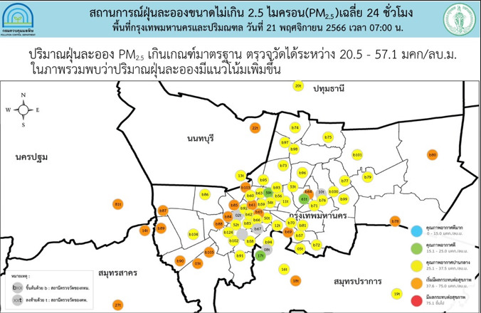 ศูนย์แก้ไขปัญหามลพิษทางอากาศรายงานการติดตามตรวจสอบคุณภาพอากาศประจำวันที่ 21 พฤศจิกายน 2566 ณ 07:00 น. พบพื้นที่ที่ปริมาณ PM2.5 เกินค่ามาตรฐาน 11 จังหวัดได้แก่ จ.นนทบุรี กรุงเทพฯ จ.นครปฐม จ.สมุทรสาคร จ.สมุทรปราการ จ.สุโขทัย จ.พิษณุโลก จ.พิจิตร จ.อุทัยธานี จ.สุพรรณบุรี และ จ. หนองคาย