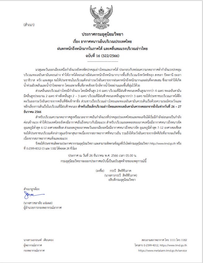 ทั้งนี้ กรมอุตุนิยมวิทยาได้ออกประกาศเรื่อง อากาศหนาวเย็นบริเวณประเทศไทย ฝนตกหนักถึงหนักมากในภาคใต้ และคลื่นลมแรงบริเวณอ่าวไทย ฉบับที่ 16 โดยขอให้ประชาชนติดตามการพยากรณ์อากาศและประกาศเตือนของกรมอุตุนิยมวิทยาอย่างใกล้ชิด