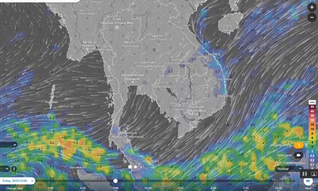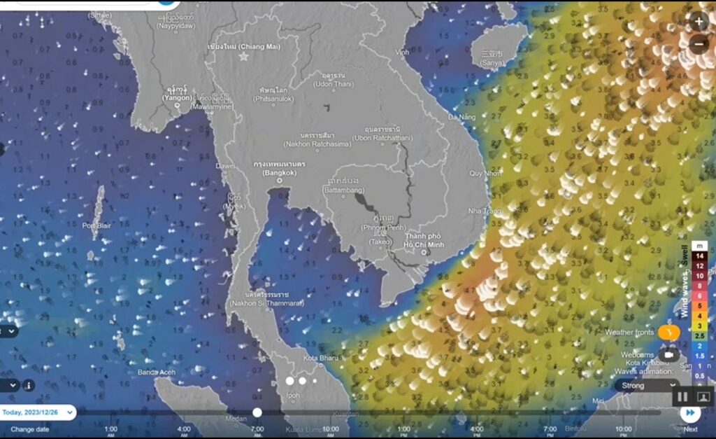 ส่วนคลื่นลมบริเวณอ่าวไทยมีกำลังแรง โดยมีคลื่นสูง 2-4 เมตร บริเวณที่มีฝนฟ้าคะนองคลื่นสูงมากกว่า 4 เมตร ทะเลอันดามันมีคลื่นสูงประมาณ 2 เมตร ห่างฝั่งคลื่นสูง 2 – 3 เมตร บริเวณที่มีฝนฟ้าคะนองคลื่นสูงมากกว่า 3 เมตร ขอให้ประชาชนบริเวณภาคใต้ฝั่งตะวันออกระวังอันตรายจากคลื่นที่ซัดเข้าหาฝั่ง ส่วนชาวเรือบริเวณอ่าวไทยและทะเลอันดามันควรเดินเรือด้วยความระมัดระวังและหลีกเลี่ยงการเดินเรือในบริเวณที่มีฝนฟ้าคะนอง ทั้งนี้เรือเล็กบริเวณอ่าวไทยและทะเลอันดามันควรงดออกจากฝั่งในช่วงวันที่ 26 – 27 ธันวาคม 2566