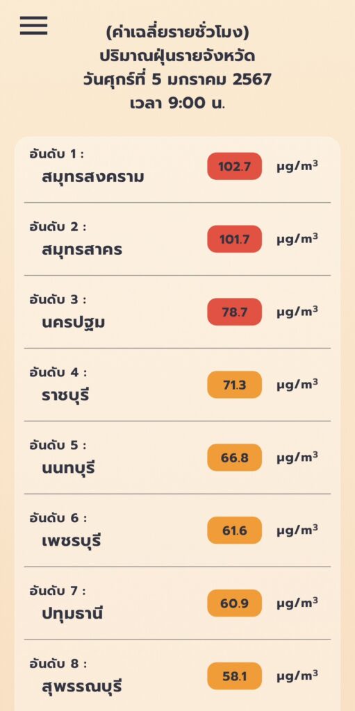 สำนักงานพัฒนาเทคโนโลยีอวกาศและภูมิสารสนเทศ (องค์การมหาชน) หรือ GISTDA รายงานสถานการณ์ฝุ่น PM 2.5 จากดาวเทียมผ่านแอปพลิเคชั่น “เช็คฝุ่น” เมื่อเวลา 9.00 น. ของวันที่ 5 มกราคม 2567 พบว่า เกินค่ามาตรฐาน 26 จังหวัด โดย 3 จังหวัดที่มีค่าเกินเกณฑ์มาตรฐานในระดับที่มีผลกระทบต่อสุขภาพสีแดงคือ สมุทรสงคราม 102.7 ไมโครกรัม สมุทรสาคร 101.7 ไมโครกรัม นครปฐม 78.7 ไมโครกรัม ส่วนอีก 23 จังหวัดมีค่าเกินเกณฑ์มาตรฐานในระดับที่เริ่มมีผลกระทบต่อสุขภาพสีส้ม โดย 5 อันดับแรกสีส้มได้แก่ ราชบุรี 71.3 ไมโครกรัม นนทบุรี 66.8 ไมโครกรัม เพชรบุรี 61.6 ไมโครกรัม ปทุมธานี 60.9 ไมโครกรัม และสุพรรณบุรี 58.1 ไมโครกรัม