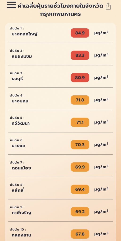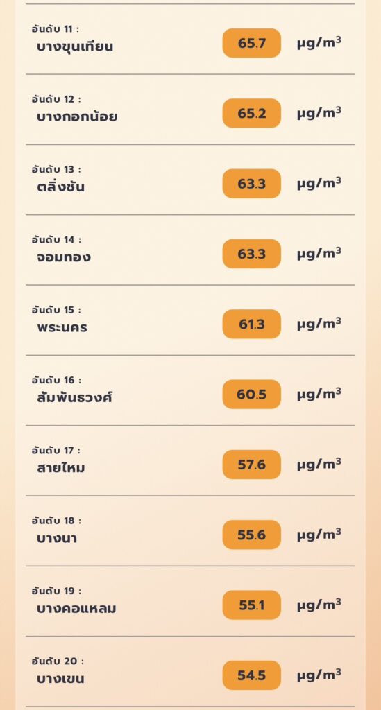 ขณะที่กรุงเทพมหานครพบค่าฝุ่น PM2.5 เกินค่ามาตรฐาน 48 เขต โดยเขตที่มีผลกระทบต่อสุขภาพสีแดง 3 เขตคือ บางกอกใหญ่ 84.9 ไมโครกรัม หนองแขม 83.3 ไมโครกรัม และธนบุรี 80.9 ไมโครกรัม ส่วนพื้นที่ที่พบค่าฝุ่นที่เริ่มมีผลกระทบต่อสุขภาพสีส้ม 45 เขต ส่วนอีก 2 เขตอยู่ในระดับปานกลางหรือสีเหลือง