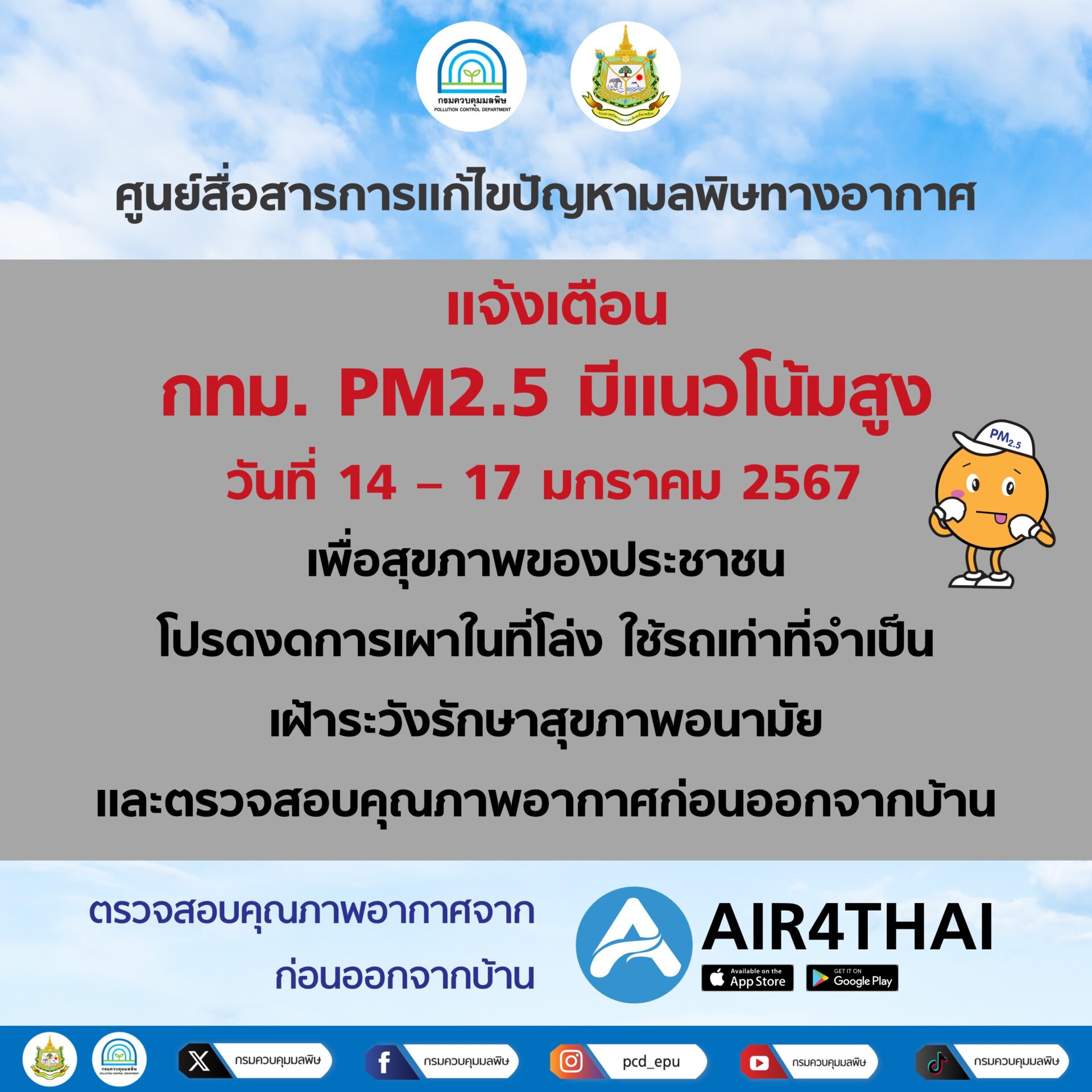 นางสาวปรีญาพร สุวรรณเกษ อธิบดีกรมควบคุมมลพิษ (คพ.) เปิดเผยว่า พล.ต.อ.พัชรวาท วงษ์สุวรรณ รองนายกรัฐมนตรีและรัฐมนตรีว่าการกระทรวงทรัพยากรธรรมชาติและสิ่งแวดล้อม ได้สั่งการให้ คพ. ประสาน กทม. เตรียมรับมือและเข้มงวดการจัดการแหล่งกำเนิดฝุ่น PM 2.5 เพื่อป้องกันผลกระทบต่อสุขภาพของประชาชน หลังจาก คพ. ตรวจสอบสถานการณ์พบว่า ในช่วงระหว่างวันที่ 14-17 มกราคม 2567 พื้นที่กรุงเทพมหานครและปริมณฑล มีแนวโน้มที่ค่าฝุ่น PM 2.5 ขึ้นสูงในหลายพื้นที่ เนื่องมาจากอัตราการระบายอากาศที่ค่อนข้างต่ำ ลมสงบ ทำให้ฝุ่นสะสมในระดับใกล้ผิวพื้น ประกอบกับแนวลมจะเปลี่ยน จากลมใต้เป็นลมตะวันออกและตะวันออกเฉียงเหนือ ส่งผลให้กรุงเทพมหานครและปริมณฑล กลายเป็นพื้นที่ท้ายลมที่ได้รับผลกระทบจากฝุ่นที่มาจากพื้นที่ใกล้เคียงได้