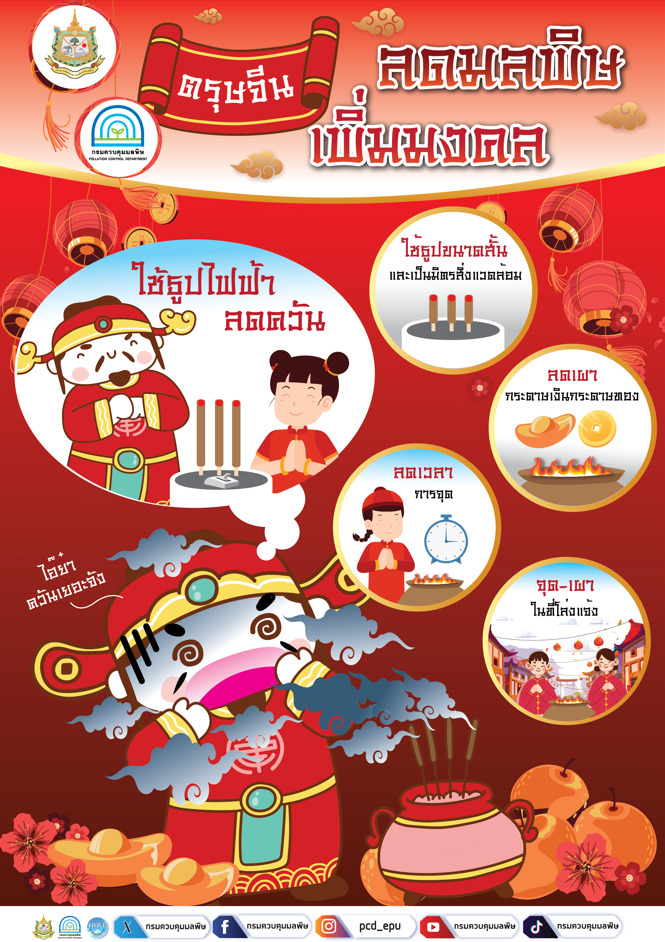 นางสาวปรีญาพร สุวรรณเกษ อธิบดีกรมควบคุมมลพิษ (คพ.) เปิดเผยว่า ตามประเพณีเทศกาลตรุษจีนจะมีการจุดธูป จุดพลุ/จุดประทัด การเผากระดาษเงินกระดาษทอง เพื่อการเคารพบรรพบุรุษและเทพเจ้า ทั้งที่บ้าน ศาลเจ้า และสถานที่ต่างๆ กิจกรรมเหล่านี้ก่อมลพิษทางอากาศที่เป็นอันตรายต่อสุขภาพประชาชนแบบภัยเงียบ งานวิจัยหลายเรื่องระบุว่า การจุดธูปและการเผากระดาษเงินกระดาษทอง จะเกิดฝุ่นขนาดเล็ก ก๊าซพิษ สารอินทรีย์ระเหยง่าย โลหะหนัก ซึ่งมีสารก่อมะเร็งบางชนิดรวมอยู่ และสารมลพิษอื่น ที่อาจจะส่งผลกระทบต่อสุขภาพได้หากมีการรับสัมผัสในปริมาณที่มากเกินไป มีอาการเบื้องต้น เช่น เกิดการระคายเคืองตาและระบบทางเดินหายใจ (แสบตา คัดจมูก จาม ไอ ระคายคอ) และหากรับสัมผัสเป็นระยะเวลาต่อเนื่องยาวนานอาจเกิดผลกระทบที่รุนแรงขึ้น