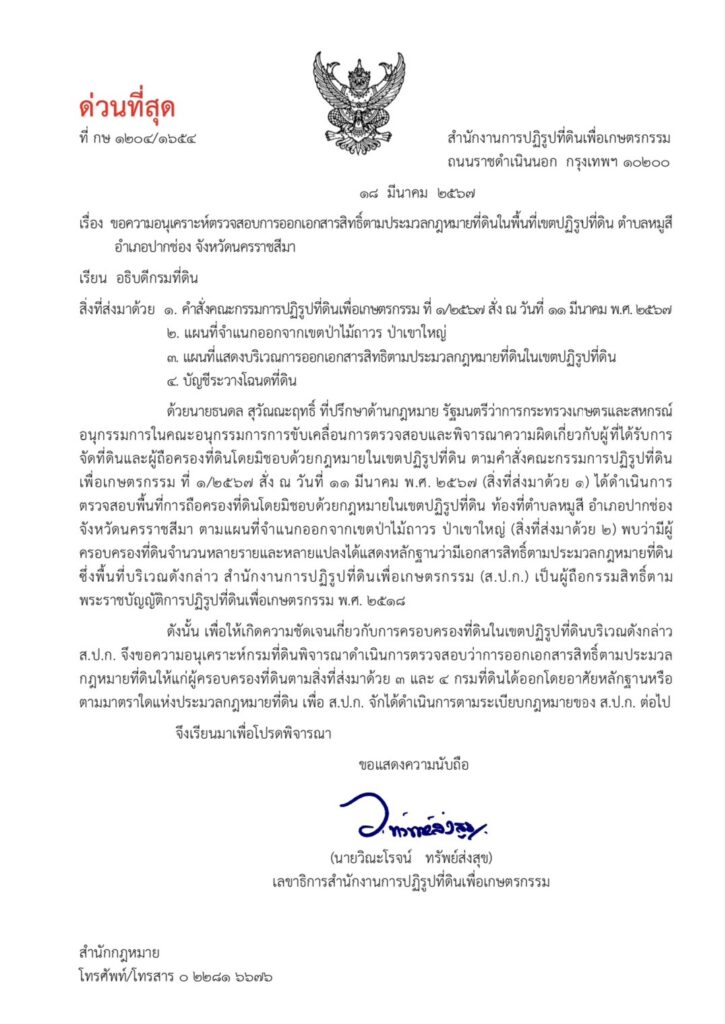 นายวิณะโรจน์ ทรัพย์ส่งสุข เลขาธิการสำนักงานการปฏิรูปที่ดินเพื่อเกษตรกรรม (ส.ป.ก.) กล่าวว่า ร้อยเอกธรรมนัส พรหมเผ่า รัฐมนตรีว่าการกระทรวงเกษตรและสหกรณ์สั่งการให้ส.ป.ก. ทำหนังสือถึงอธิบดีกรมที่ดินเพื่อขอให้เร่งตรวจสอบเอกสารสิทธิตามประมวลกฎหมายที่ดินที่ออกให้แก่ผู้ครอบครองที่ดินหลายรายในอำเภอปากช่อง จังหวัดนครราชสีมา โดยพื้นที่ดังกล่าวอยู่ในเขตปฏิรูปที่ดินซึ่งเป็นกรรมสิทธิ์ของส.ป.ก. ตามพระราชบัญญัติการปฏิรูปที่ดินเพื่อเกษตรกรรม พ.ศ. 2518