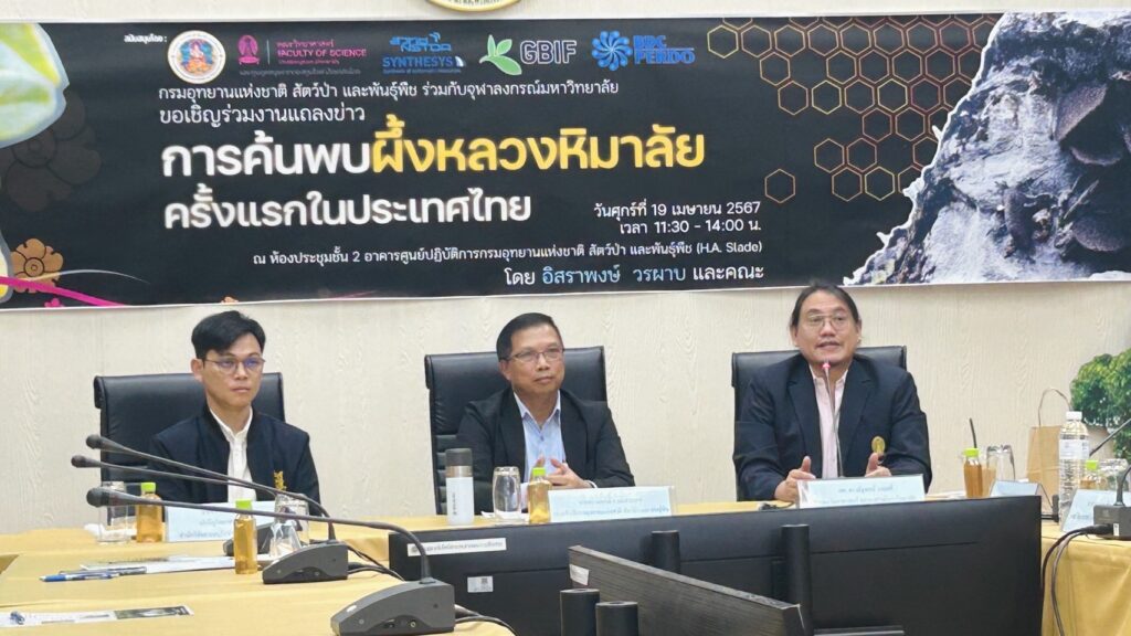 นายทรงเกียรติ ตาตะยานนท์ รองอธิบดีกรมอุทยานแห่งชาติ สัตว์ป่า และพันธุ์พืช พร้อมด้วยทีมนักวิจัย นายอิสราพงษ์ วรผาบ นักกีฏวิทยาชำนาญการ (กรมอุทยานแห่งชาติฯ) นายนนธวัช ฉัตรธนบูรณ์ ดร.ชวธัช ธนูสิงห์ และ ผศ.ดร.ณัฐพจน์ วาฤทธิ์ ภาควิชาชีววิทยา คณะวิทยาศาสตร์ จุฬาลงกรณ์มหาวิทยาลัย ร่วมแถลงข่าว “การค้นพบผึ้งหลวงหิมาลัยครั้งแรกในประเทศไทย”