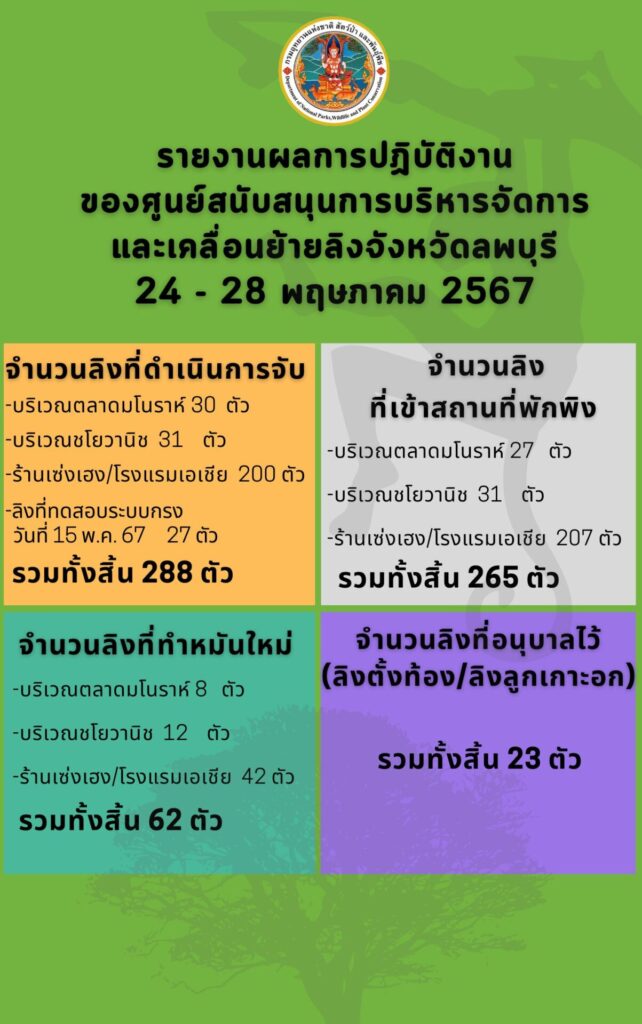 นายอรรถพล เจริญชันษา อธิบดีกรมอุทยานแห่งชาติ สัตว์ป่า และพันธุ์พืช เปิดเผยว่าตามที่กรมอุทยานแห่งชาติ สัตว์ป่า และพันธุ์พืช ร่วมกับเทศบาลเมืองลพบุรีและจังหวัดลพบุรีเปิดยุทธการดักจับลิงในตัวเมืองลพบุรีที่สร้างความเดือดร้อนให้แก่ประชาชน โดยสามารถดักจับได้รวม 288 ตัว