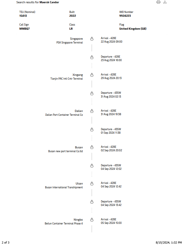 เรือ Maersk Candor จะออกจากสิงคโปร์วันที่ 23 สิงหาคมถึงท่าเรือ Xingang ของจีนวันที่ 29 สิงหาคม ออกจากท่าเรือ Xingang วันที่ 31 สิงหาคมไปเทียบท่าเรือ Dalian วันที่ 31 สิงหาคม ออกจากท่าเรือ Dalian วันที่ 1 กันยายนไปเทียบท่าเรือ Busan ของเกาหลีใต้วันที่ 2 กันยายน ออกจากท่าเรือ Busan วันที่ 4 กันยายน แล้วเดินทางต่อไปเส้นทางเดียวกับเรือ MAERSK CAMPTON และกลับไปยังสิงคโปร์ในวันที่ 16 กันยายน