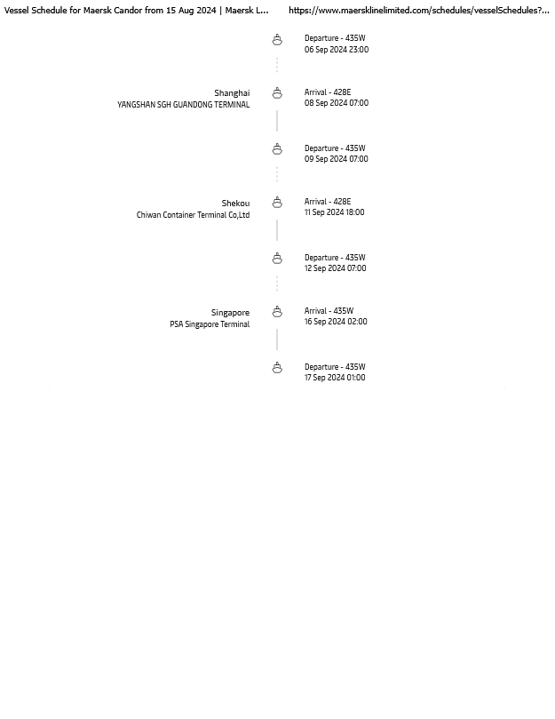 จากการตรวจสอบตารางเดินเรือในวันนี้ (15 สิงหาคม 2567) พบว่า ตารางเดินเรือ MAERSK CAMPTON มีการเปลี่ยนแปลง โดยเมื่อเทียบกับตารางเดินเรือวันที่ 11 สิงหาคม 2567 เรือ MAERSK CAMPTON จะถึงท่าเรือของสิงคโปร์วันนี้ เวลา 19.00 น. แต่ตารางเดินเรือที่เปลี่ยนแปลงใหม่ระบุว่า จะถึงท่าเรือสิงคโปร์ในวันที่ 18 สิงหาคม 2567 เวลา 07.00 น. ส่วนเรือ Maersk Candor ยังคงเดิมซึ่งจะถึงท่าเรือสิงคโปร์ในวันที่ 22 สิงหาคม 2567 เวลา 09.00 น.