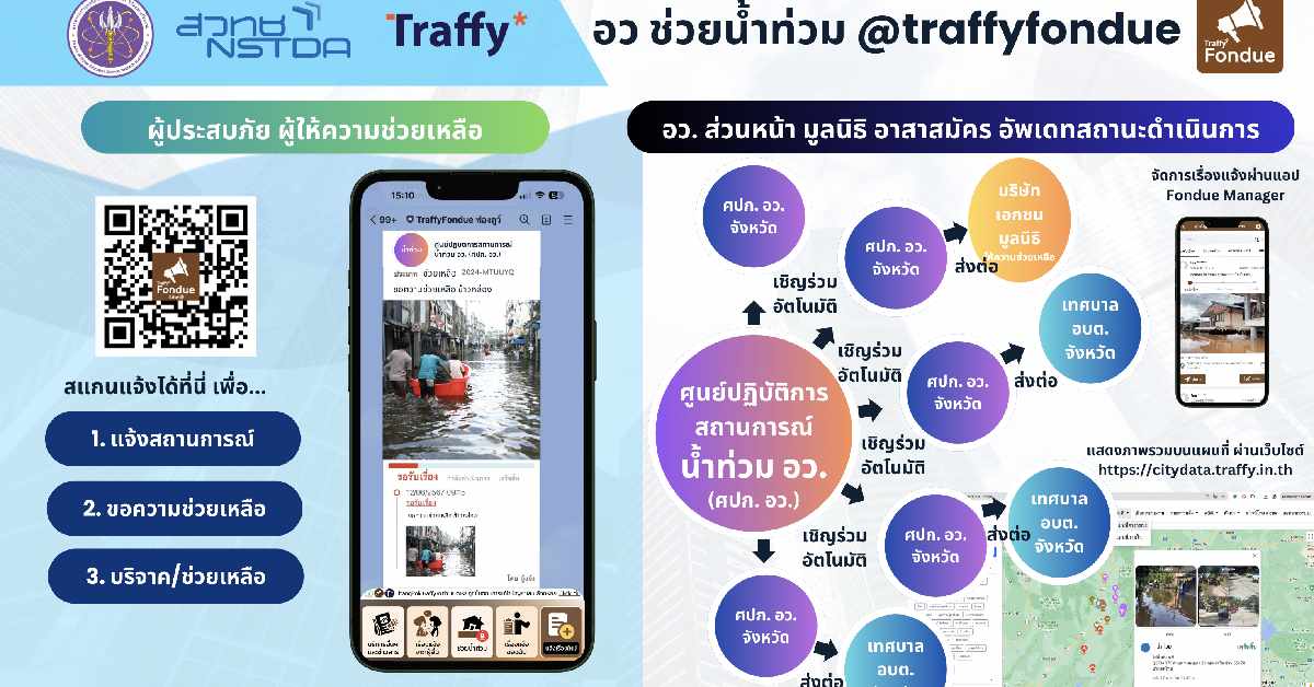 นางสาวศุภมาส อิศรภักดี รัฐมนตรีว่าการกระทรวงการอุดมศึกษา วิทยาศาสตร์ วิจัยและนวัตกรรม (อว.) กล่าวว่า ได้มอบหมายให้สำนักงานพัฒนาวิทยาศาสตร์และเทคโนโลยีแห่งชาติ (สวทช.) เพิ่มเมนูพิเศษ “ช่วยน้ำท่วม” บนแพลตฟอร์ม TraffyFondue (ทราฟฟี ฟองดูว์) เพื่อเป็นช่องทางด่วนพิเศษในการช่วยเหลือผู้ประสบอุทกภัยซึ่งเป็นการนำเทคโนโลยีมาใช้ช่วยเหลือประชาชนอย่างรวดเร็วและมีประสิทธิภาพ