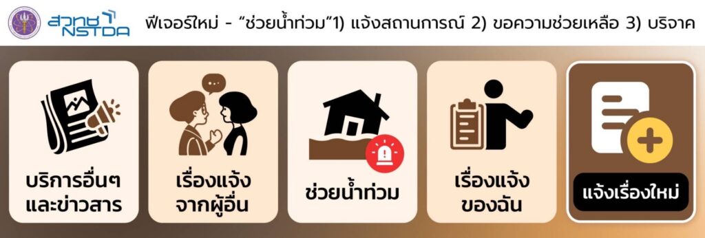 สำหรับฟีเจอร์ “ช่วยน้ำท่วม” ประกอบด้วย 3 ฟังก์ชันหลัก ได้แก่ 1.แจ้งสถานการณ์ โดยผู้ใช้สามารถรายงานสถานการณ์น้ำท่วมในพื้นที่ พร้อมแนบรูปภาพและพิกัด 2.ขอความช่วยเหลือ โดยสามารถส่งคำร้องขอความช่วยเหลือโดยตรงไปยัง อว. ส่วนหน้าใน 76 จังหวัด และ 3. บริจาคซึ่งสามารถประสานงานกับ อว. ส่วนหน้าเพื่อรับบริจาคสิ่งของช่วยเหลือผู้ประสบภัย