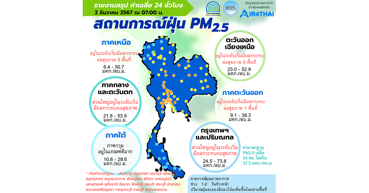 ศูนย์สื่อสารการแก้ไขปัญหามลพิษทางอากาศ กรมควบคุมมลพิษ (คพ.) รายงานผลการติดตามตรวจสอบคุณภาพอากาศประจำวันที่ 2 ธันวาคม 2567 ณ 07:00 น. พบปริมาณ PM2.5 ในประเทศเกินค่ามาตรฐาน 27 จังหวัดได้แก่ กทม. จ. ปทุมธานี จ.นนทบุรี จ. นครปฐม จ. สมุทรสาคร จ. สมุทรปราการ จ. พิษณุโลก จ.พิจิตร จ.เพชรบูรณ์ จ.นครสวรรค์ จ. อุทัยธานี จ. ชัยนาท จ. สิงห์บุรี จ. ลพบุรี จ. สระบุรี จ. อ่างทอง จ.พระนครศรีอยุธยา จ. กาญจนบุรี จ.ราชบุรี จ. สมุทรสงคราม จ. เพชรบุรี จ.ฉะเชิงเทรา จ. หนองคาย จ.เลย จ.ขอนแก่น จ.กาฬสินธุ์ และ จ.อุบลราชธานี