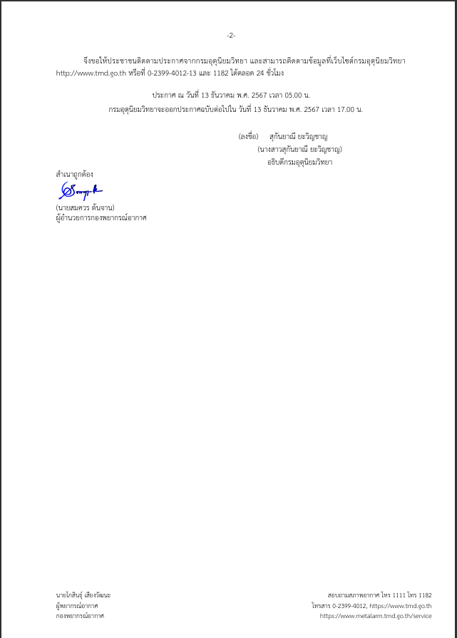 ขอให้ประชาชนติดตามประกาศจากกรมอุตุนิยมวิทยา และสามารถติดตามข้อมูลที่เว็บไซต์กรมอุตุนิยมวิทยา http://www.tmd.go.th หรือที่ 0-2399-4012-13 และ 1182 ได้ตลอด 24 ชั่วโมง. -512 – สำนักข่าวไทย