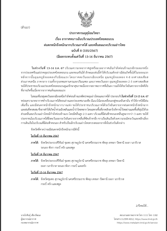 นายสมควร ย้ำว่า จากการที่มวลอากาศเย็นแผ่ปกคลุมประเทศไทยตอนบน ขณะที่มรสุมตะวันออกเฉียงเหนือกำลังค่อนข้างแรงพัดปกคลุมอ่าวไทยและภาคใต้ ประกอบกับในช่วงวันที่ 13-15 ธันวาคม 2567 หย่อมความกดอากาศต่ำบริเวณภาคใต้ตอนล่างและประเทศมาเลเซียมีแนวโน้มจะเคลื่อนลงสู่ทะเลอันดามัน จะทำให้ภาคใต้มีฝนเพิ่มขึ้น โดยมีฝนตกหนักถึงหนักมากบางแห่ง ขอให้ประชาชนบริเวณภาคใต้ระวังอันตรายจากฝนตกหนักถึงหนักมาก