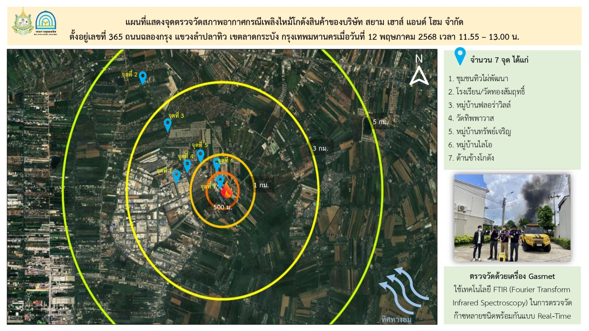 ในวันนี้ (12 พฤษภาคม 2568) คพ. ได้ลงพื้นที่ตรวจวัดไอระเหยของสารเคมีและก๊าซอันตรายจากจุดเพลิงไหม้ โดยใช้เครื่องมือตรวจวัดในอากาศรวม 7 จุด ภายในรัศมี 5 กิโลเมตร ตั้งแต่เวลา 11.55 – 13.00 น. พบรายละเอียดดังนี้
