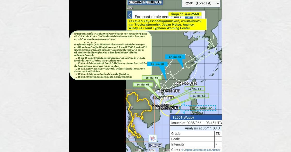 11 มิ.ย. – นายชวลิต จันทรรัตน์ ประธานเจ้าหน้าที่บริหาร บมจ.ทีม คอนซัลติ้ง เอนจิเนียริ่ง แอนด์ แมเนจเมนท์ (TEAMG) ระบุพายุโซนร้อนหวู่ติ๊บ ทำให้ฝนตกหนักมากที่ไหหลำ และฝนตกหนักที่ฮ่องกง เซี่ยงไฮ้ ระหว่างวันที่ 12-17 มิ.ย. 68 โดยทั่วไปจะทำให้ไทยมีฝนตกเพิ่มขึ้น โดยเฉพาะอย่างยิ่งในภาคตะวันตก และภาคตะวันออก
