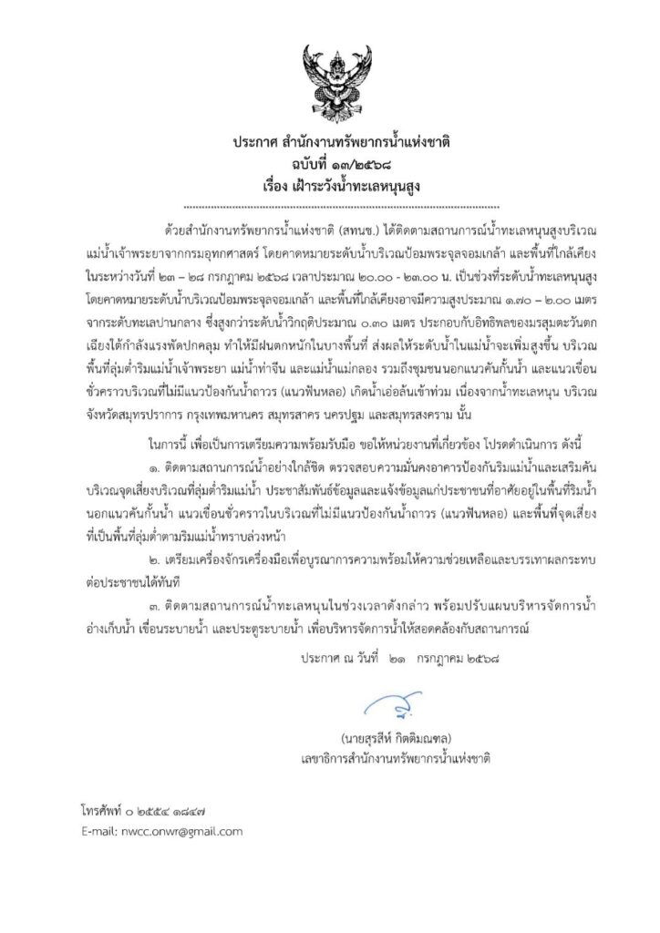 สำนักงานทรัพยากรน้ำแห่งชาติ (สทนช.) ออกประกาศฉบับที่ 13/2568 เตือนสถานการณ์น้ำทะเลหนุนสูงในช่วงวันที่ 23–28 กรกฎาคม 2568 ระหว่างเวลา 20.00–23.00 น. โดยคาดว่าระดับน้ำบริเวณป้อมพระจุลจอมเกล้าและพื้นที่ใกล้เคียงอาจสูงถึง 1.70–2.00 เมตร จากระดับทะเลปานกลาง ซึ่งสูงกว่าระดับน้ำวิกฤติประมาณ 0.30 เมตร อาจทำให้เกิดน้ำเอ่อล้นในพื้นที่ลุ่มต่ำริมแม่น้ำเจ้าพระยา ท่าจีน และแม่กลอง โดยเฉพาะบริเวณที่ไม่มีแนวป้องกันถาวร