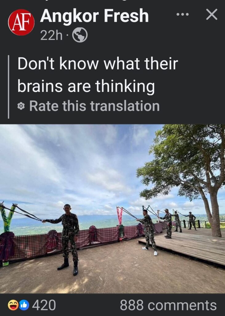 กรณีที่เพจข่าว Angkor Fresh ของกัมพูชาเผยแพร่ภาพบุคคลในชุดลายพราง ขณะใช้หนังสติ๊กขนาดใหญ่ พร้อมข้อความ “Don’t know what their brains are thinking” จนกลายเป็นกระแสในสื่อออนไลน์กัมพูชา โดยมีการตั้งข้อสังเกตว่าเป็นเจ้าหน้าที่ทหารไทยจำลองการใช้อาวุธและอาจเชื่อมโยงกับความขัดแย้งชายแดนระหว่างสองประเทศนั้น