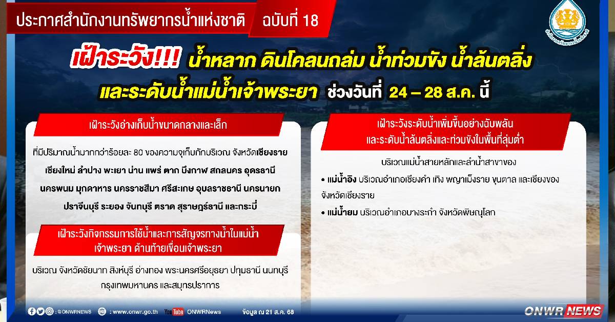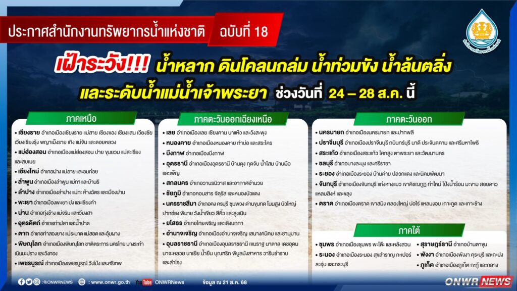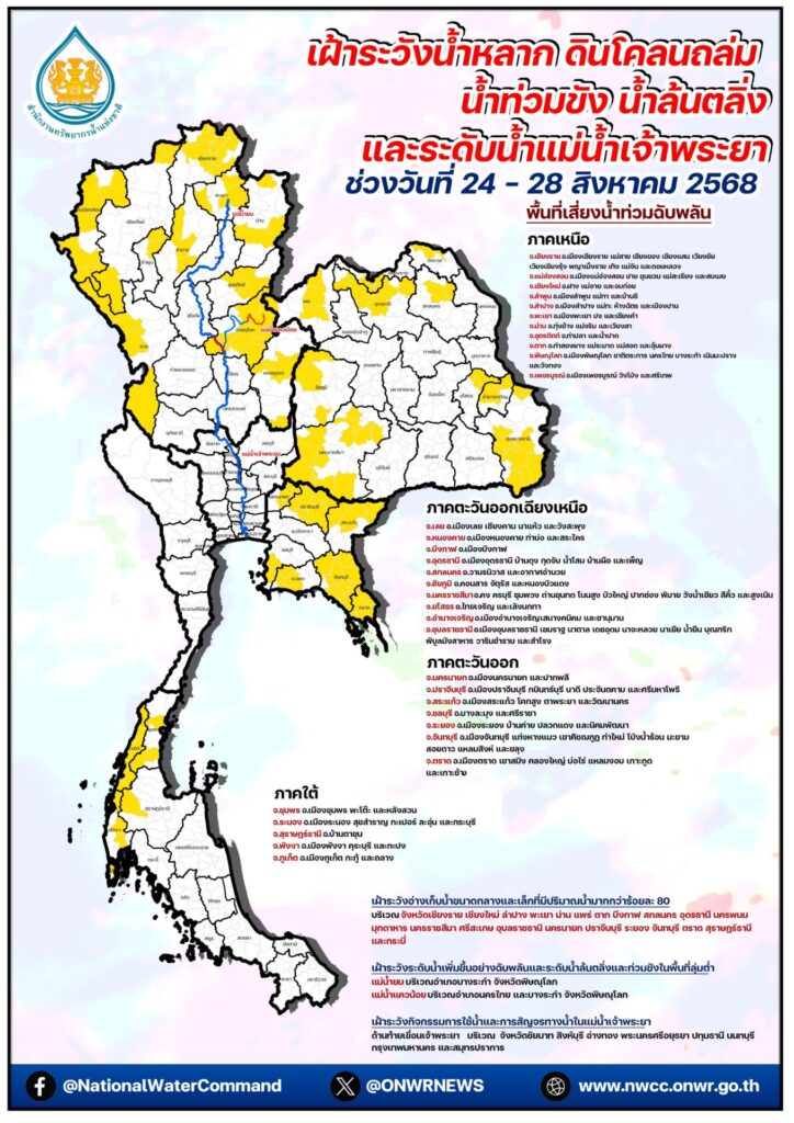 ทั้งนี้ สำนักงานทรัพยากรน้ำแห่งชาติ (สทนช.) ได้ประกาศแจ้งเตือนล่วงหน้าเมื่อวันที่ 21 สิงหาคมที่ผ่านมา เพื่อให้หน่วยงานที่เกี่ยวข้องเตรียมความพร้อม โดยเฉพาะในพื้นที่เสี่ยงซ้ำซาก เช่น