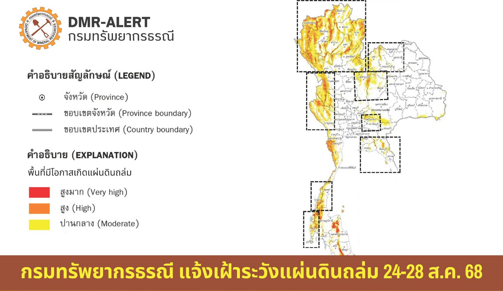 กรมทรัพยากรธรณี กระทรวงทรัพยากรธรรมชาติและสิ่งแวดล้อม ออกประกาศ เตือนภัยดินถล่มและน้ำป่าไหลหลาก ครอบคลุม 35 จังหวัด 248 อำเภอทั่วประเทศ ระหว่างวันที่ 24–28 สิงหาคม 2568 จากอิทธิพลของ พายุไต้ฝุ่น “คาจิกิ” และมรสุมตะวันตกเฉียงใต้ที่กำลังแรง ทำให้หลายพื้นที่มีฝนตกหนักถึงหนักมากต่อเนื่อง