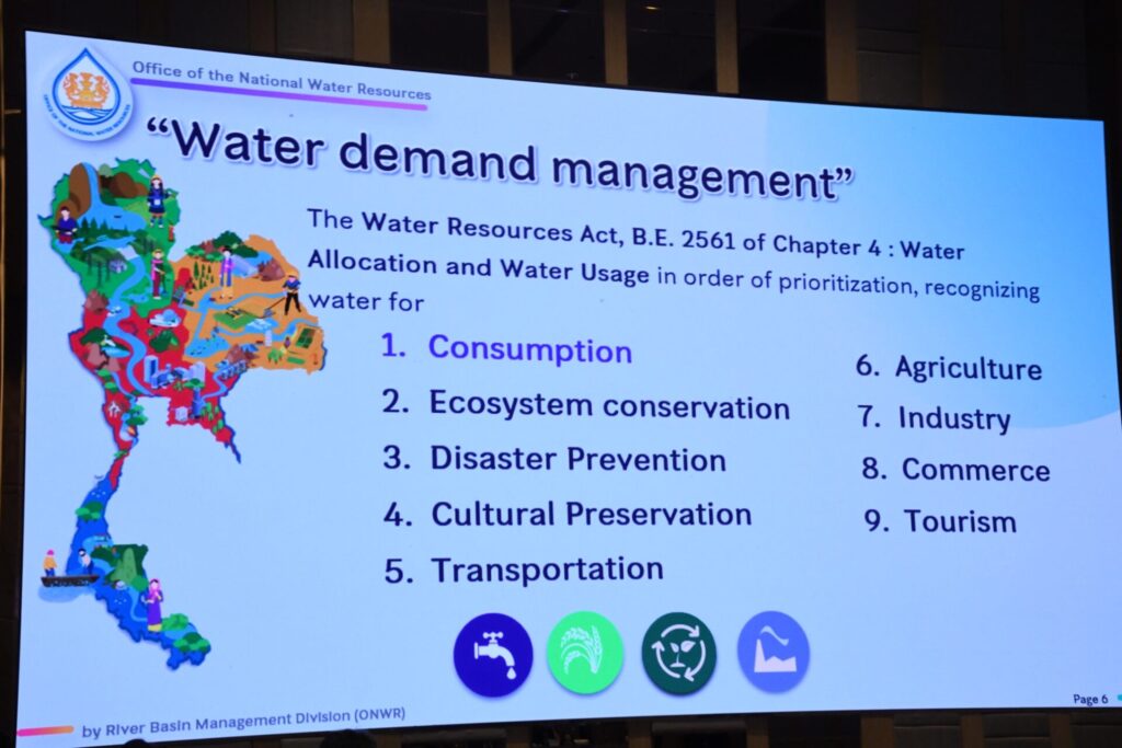 เลขาธิการ สทนช. กล่าวว่า จากแนวคิดของ FAO ได้ชี้ให้เห็นว่า หลายประเทศทั่วโลก รวมทั้งประเทศไทย กำลังเผชิญความท้าทายด้านการจัดสรรน้ำ ซึ่งยังไม่สอดคล้องกับกฎหมายหรือหลักความเป็นธรรมในบางมิติ จึงได้พัฒนาแนวคิดรูปแบบการถือครองทรัพยากรน้ำ หรือ Water Tenure เพื่อทำความเข้าใจรูปแบบการใช้น้ำอย่างรอบด้าน ครอบคลุมทั้งกิจกรรมที่เป็นทางการและกิจกรรมที่อาจถูกมองข้าม แนวคิดนี้จะช่วยสร้างความสมดุลในการจัดสรรน้ำ เพิ่มประสิทธิภาพ และส่งเสริมการมีส่วนร่วมของผู้ใช้น้ำทุกภาคส่วน ภายใต้การสนับสนุนของรัฐบาลเยอรมนีและรัฐบาลออสเตรเลีย โดยประเทศไทยเป็นหนึ่งในสองประเทศนำร่องของโครงการ ScaleWat หรือ Scaling up Water Tenure Governance in Thailand ร่วมกับประเทศโคลัมเบียที่อยู่ในภูมิภาคละตินอเมริกา ซึ่งถือเป็นโอกาสในการประยุกต์ใช้ทฤษฎีระดับสากลในการบริหารจัดการน้ำของประเทศและในภูมิภาคเอเชีย โดยได้เลือก “ลุ่มน้ำประแสร์” เป็นพื้นที่ศึกษา เนื่องจากเป็นลุ่มน้ำสำคัญทางเศรษฐกิจที่ต้องรองรับการใช้น้ำของจังหวัดระยองและเขตพัฒนาพิเศษภาคตะวันออก (EEC) ที่คาดว่า จะมีความต้องการใช้น้ำเพิ่มสูงขึ้นในอนาคต โดยได้มีการลงนามข้อตกลงความร่วมมือเพื่อเริ่มดำเนินงานในประเทศไทยเมื่อวันที่ 29 ตุลาคม 2567 มุ่งเน้นการพัฒนาระเบียบวิธีและเครื่องมือเพื่อประเมินรูปแบบการถือครองน้ำ และความรับผิดชอบในการใช้น้ำ รวมทั้งส่งเสริมหลักธรรมาภิบาล สนับสนุนความมั่นคงทางอาหาร การปรับตัวต่อการเปลี่ยนแปลงสภาพภูมิอากาศและการมีส่วนร่วมของสังคม