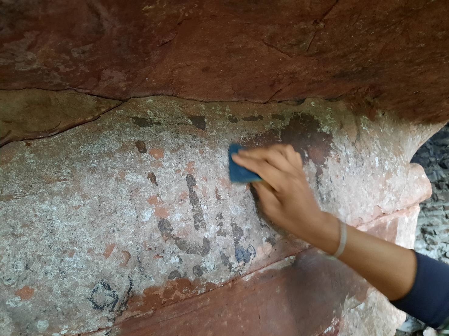 ขณะจุดที่ยากที่สุดคือจุดที่มีการเซาะร่องหิน ต้องใช้เทคนิคเดียวกันกับการฟื้นฟูสภาพของฟอสซิลไดโนเสาร์ นำหินบริเวณถ้ำนาคาซึ่งเป็นหินชนิดเดียวกันบดเป็นผงผสมสารประสาน นำไปอุดร่องหินที่ถูกขูดขีดเซาะทำลาย จนไม่เหลือร่องรอยเดิม และมีสภาพใกล้เคียงกับพื้นผิวหินลักษณะเดิมมากที่สุด จากนั้นจะปล่อยให้กระบวนการทางธรรมชาติฟื้นฟูตัวเองต่อไป