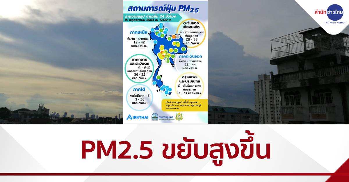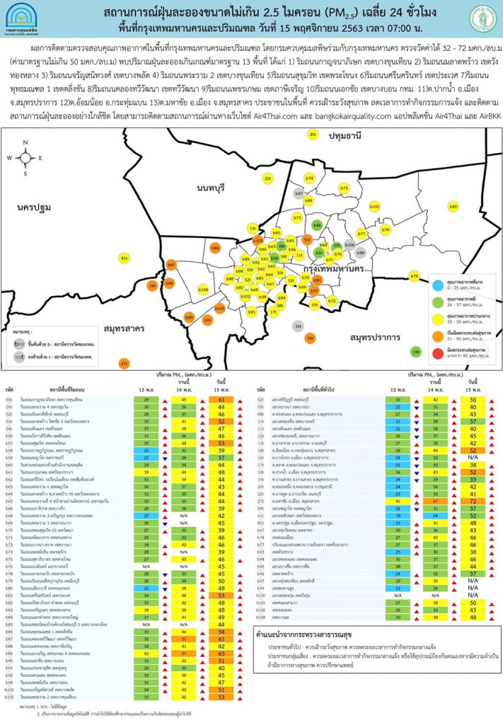 โดยกรุงเทพมหานครและปริมณฑล สถานีตรวจวัดของ คพ.ร่วมกับ กทม. พบค่าฝุ่น PM2.5 ปริมาณสูงขึ้นกว่าเมื่อวาน (14 พ.ย.) เกือบทุกพื้นที่ โดยปริมาณฝุ่นละออง PM2.5 ตรวจวัดค่าได้ระหว่าง 34-73 ไมโครกรัม/ลูกบาศก์เมตร เกินเกณฑ์มาตรฐาน 21 พื้นที่ สูงสุดที่ถนนมาเจริญ เพชรเกษม 8 เขตหนองแขม 65 ไมโครกรัม/ลูกบาศก์เมตร รองลงมาเขตทวีวัฒนา 61 ไมโครกรัม/ลูกบาศก์เมตร ส่วนสูงสุดอยู่ที่ ต.มหาชัย อ.เมือง จ.สมุทรสาคร 72 ไมโครกรัม/ลูกบาศก์เมตร