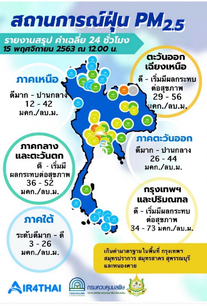 ศูนย์แก้ไขปัญหามลพิษทางอากาศ รายงานการติดตามตรวจสอบคุณภาพอากาศ ประจำวันที่ 15 พฤศจิกายน 2563 เวลา 12.00 น.พบปริมาณ PM2.5 ภาพรวมทั่วประเทศ ตรวจวัดได้ 3-73 ไมโครกรัม/ลูกบาศก์เมตร เกินมาตรฐานที่กรุงเทพมหานคร, สมุทรสาคร, สมุทรปราการ, สุพรรณบุรี และหนองคาย