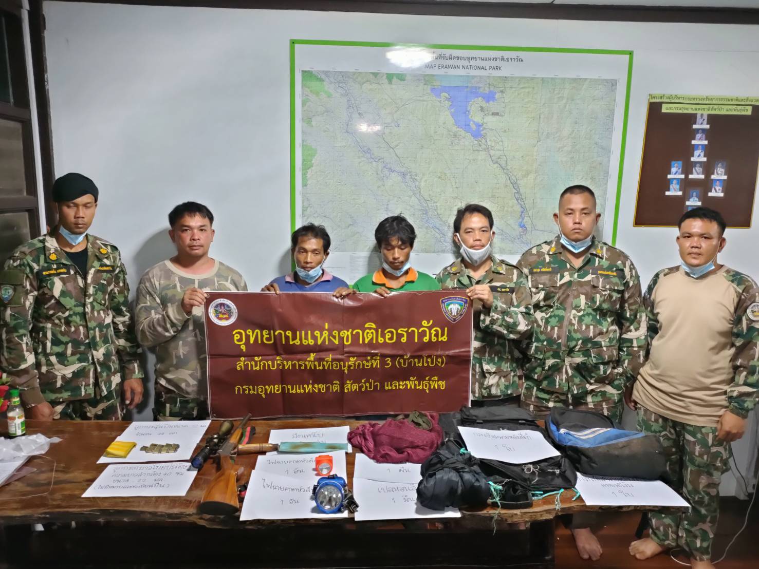 นายนิพนธ์ จำนงสิริศักดิ์ ผู้อำนวยการสำนักบริหารพื้นที่อนุรักษ์ที่ 3 (บ้านโป่ง) เปิดเผยว่า เจ้าหน้าที่หน่วยพิทักษ์ป่าของอุทยานแห่งชาติเอราวัณสืบทราบว่า ชาวพม่าที่ได้ลักลอบเข้าเมืองจังหวัดกาญจนบุรี จะเข้าไปล่าสัตว์ป่าในเขตอุทยานแห่งชาติเอราวัณ ท้องที่ป่าบ้านท่าเสา หมู่ที่ 3 บ้านท่าเสา ต.ท่าเสา อ.ไทรโยค จ. กาญจนบุรี จึงได้วางกำลังดักซุ่มรอ จนพบชาวพม่าพร้อมอาวุธปืนล่าสัตว์เดินเข้ามาในเขตพื้นที่ของอุทยานฯ จึงเข้าแสดงตัวและจับกุม