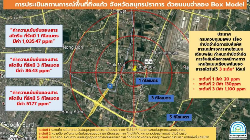 นอกจากนี้ กองจัดการคุณภาพอากาศและเสียงได้คำนวณค่าความเข้มข้นของสารสไตรีน โดยใช้ Box Model ซึ่งใช้ข้อมูลอัตราการระบายจากแหล่งกำเนิด มาประมวลผลร่วมกับสภาพอุตุนิยมวิทยาของพื้นที่ คำนวณจากรัศมี ใน 3 ระยะ ได้แก่ ระยะ 1 กิโลเมตร 3 กิโลเมตร และ 5 กิโลเมตร ซึ่งจากการคำนวณจะได้ค่าความเข้มข้นของสารสไตรีน ดังนี้ รัศมี 1 กิโลเมตร มีค่า 1,035.47 ppm (หนึ่งในล้านส่วน) รัศมี 3 กิโลเมตร มีค่า 86.43 ppm และรัศมี 5 กิโลเมตร มีค่า 51.77 ppm ทั้งนี้กรมควบคุมมลพิษออกประกาศเรื่อง กำหนดค่าขีดจำกัดการรับสัมผัสสารเคมีทางการหายใจแบบเฉียบพลันของสารสไตรีนไว้ 3 ระดับ ได้แก่ ระดับที่ 1 มีค่า 20 ppm ซึ่งเป็นระดับความเข้มข้นสูงสุดของสารเคมีในบรรยากาศ ที่ไม่ก่อให้เกิดผลกระทบต่อสุขภาพของประชาชน ระดับที่ 2 มีค่า 130 ppm ซึ่งเป็นระดับที่ก่อให้เกิดผลกระทบต่อสุขภาพอย่างไม่ร้ายแรง และระดับที่ 3 มีค่า 1,100 ppm ซึ่งเป็นระดับที่ก่อให้เกิดผลกระทบต่อสุขภาพอย่างร้ายแรง แต่ไม่ถึงขั้นเสียชีวิต