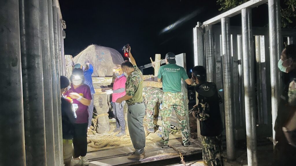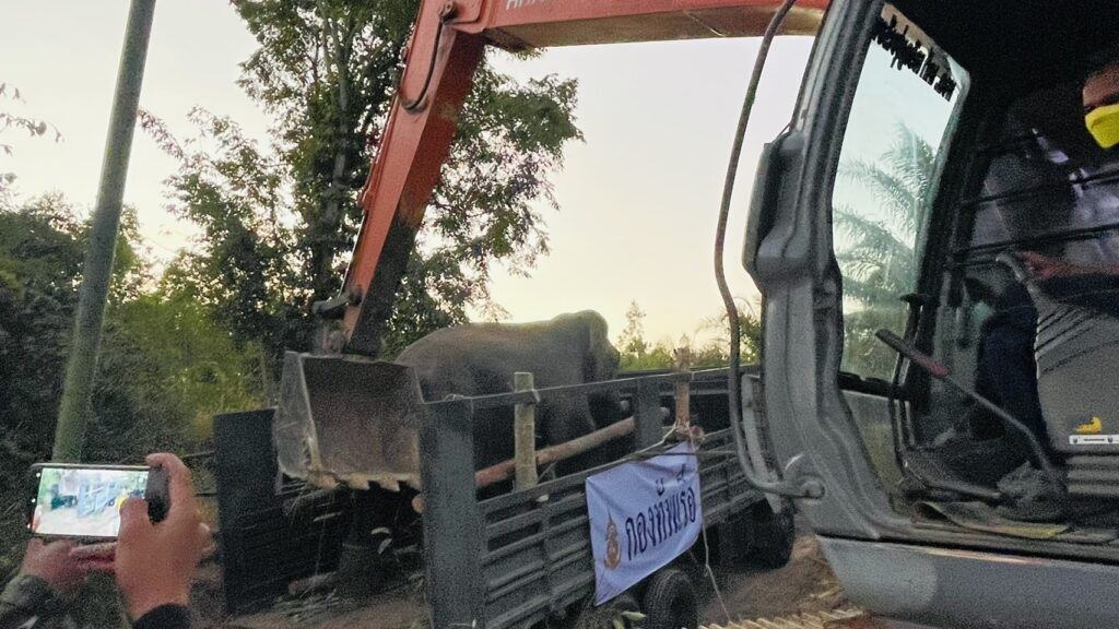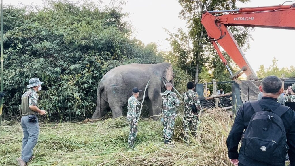 - 18.15 น. สามารถดึงช้างขึ้นรถบรรทุกได้เรียบร้อย ระหว่างการเคลื่อนย้าย มีสัตวแพทย์ดูแลอย่างใกล้ชิด ระยะทางประมาณ 30 กม. ใช้เวลา 1 ชั่วโมง