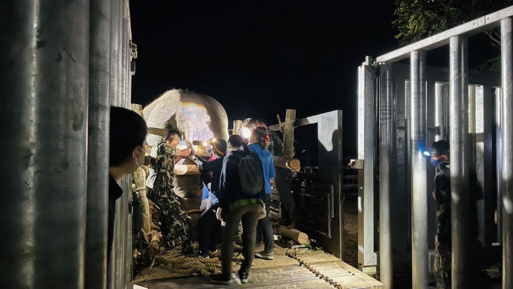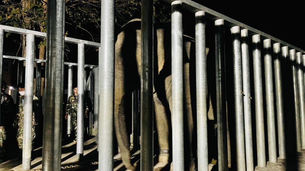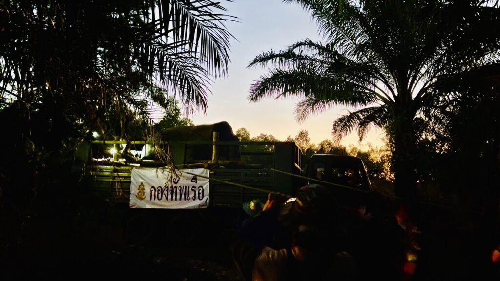 - 11.00 น. เจ้าหน้าที่เตรียมคอกบนรถบรรทุกและโซ่สำหรับคล้องขาช้าง