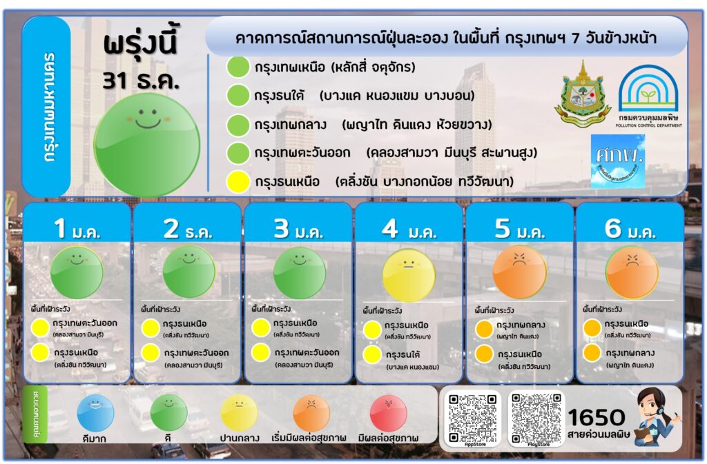 นายอรรถพล เจริญชันษา อธิบดีกรมควบคุมมลพิษกล่าวว่า ศูนย์แก้ไขปัญหามลพิษทางอากาศ (ศกพ.) รายงานผลคาดการณ์คุณภาพอากาศ 7 วันล่วงหน้า ตั้งแต่วันที่ 31 ธันวาคม 64 ถึงวันที่ 6 มกราคม 65 ซึ่งพบว่า คุณภาพอากาศในประเทศไทยอยู่ในเกณฑ์ดี