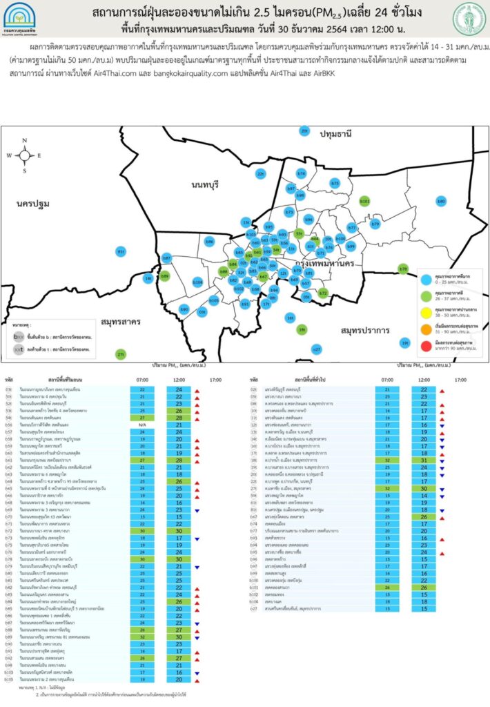 สำหรับคุณภาพอากาศประจำวันนี้ (30 ธ.ค.) ศกพ. ติดตามตรวจสอบคุณภาพอากาศเมื่อเวลา 12:00 น. ปรากฏว่า ผลการตรวจวัด PM2.5 ในประเทศอยู่ในเกณฑ์มาตรฐานทั้งหมด ภาพรวมอยู่ในเกณฑ์ดีมาก ไม่เกินค่ามาตรฐานที่ 50 มคก./ลบ.ม. โดยมีรายละเอียดตามพื้นที่ดังนี้
