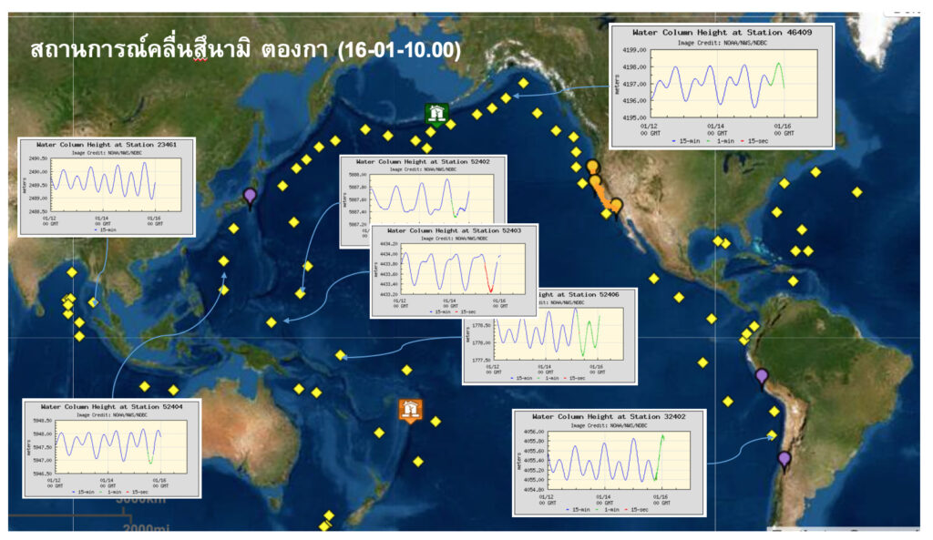 ศ. กิตติคุณ ดร. ปัญญา จารุศิริ จุฬาลงกรณ์มหาวิทยาลัยและปรึกษาให้กับกรมทรัพยากรธรณีกล่าวว่า เหตุการณ์ภูเขาไฟระเบิดใต้ทะเลบริเวณประเทศตองกาเมื่อเวลา 11.27 วานนี้ (15 ม.ค) ตามเวลาประเทศไทย ทำให้เกิดคลื่นสึนามิเคลื่อนตัวเข้าหาชายฝั่งหลายๆ ประเทศรอบมหาสมุทรแปซิฟิก โดยมีความสูงคลื่นประมาณ 0.1- 1.2 เมตรเช่น ที่ฟิลิปปินส์ 0.20 เมตร ญี่ปุ่น นิวซีแลนด์ และชิลี 1.0-1.2 เมตร ทั้งนี้ศูนย์เตือนภัยสึนามิแปซิฟิกออกคำเตือนฉบับที่ 11 เมื่อเวลา 08.45 วันนี้ (16 ม.ค.) และยืนยันการเกิดสึนามิดังกล่าว
