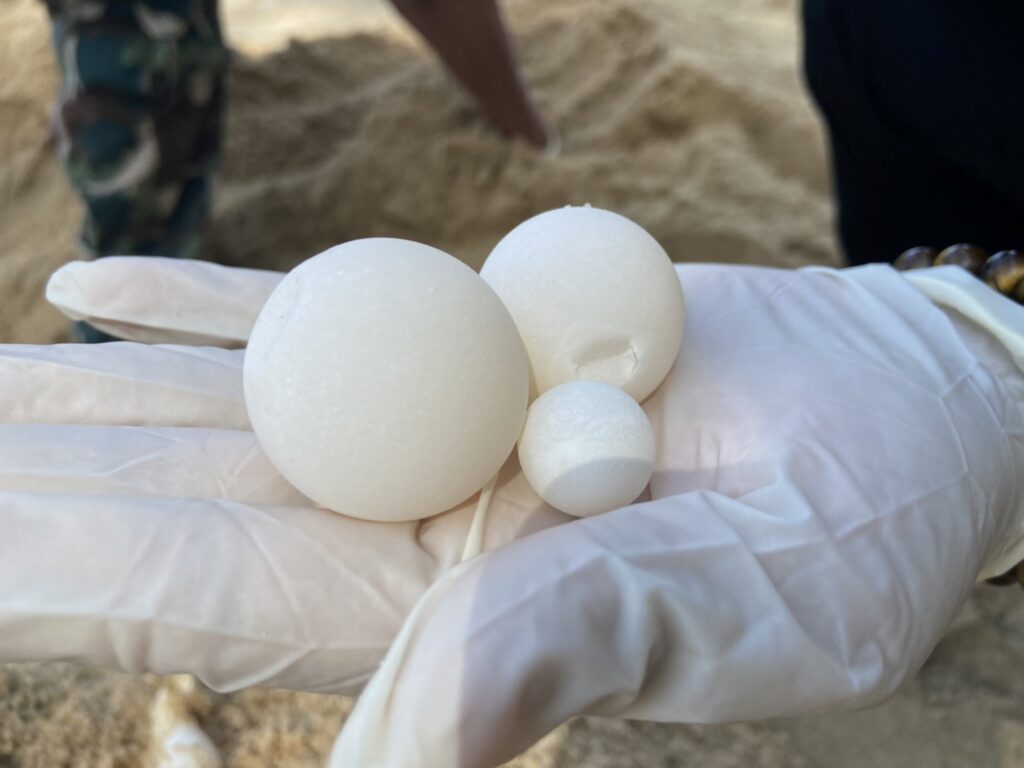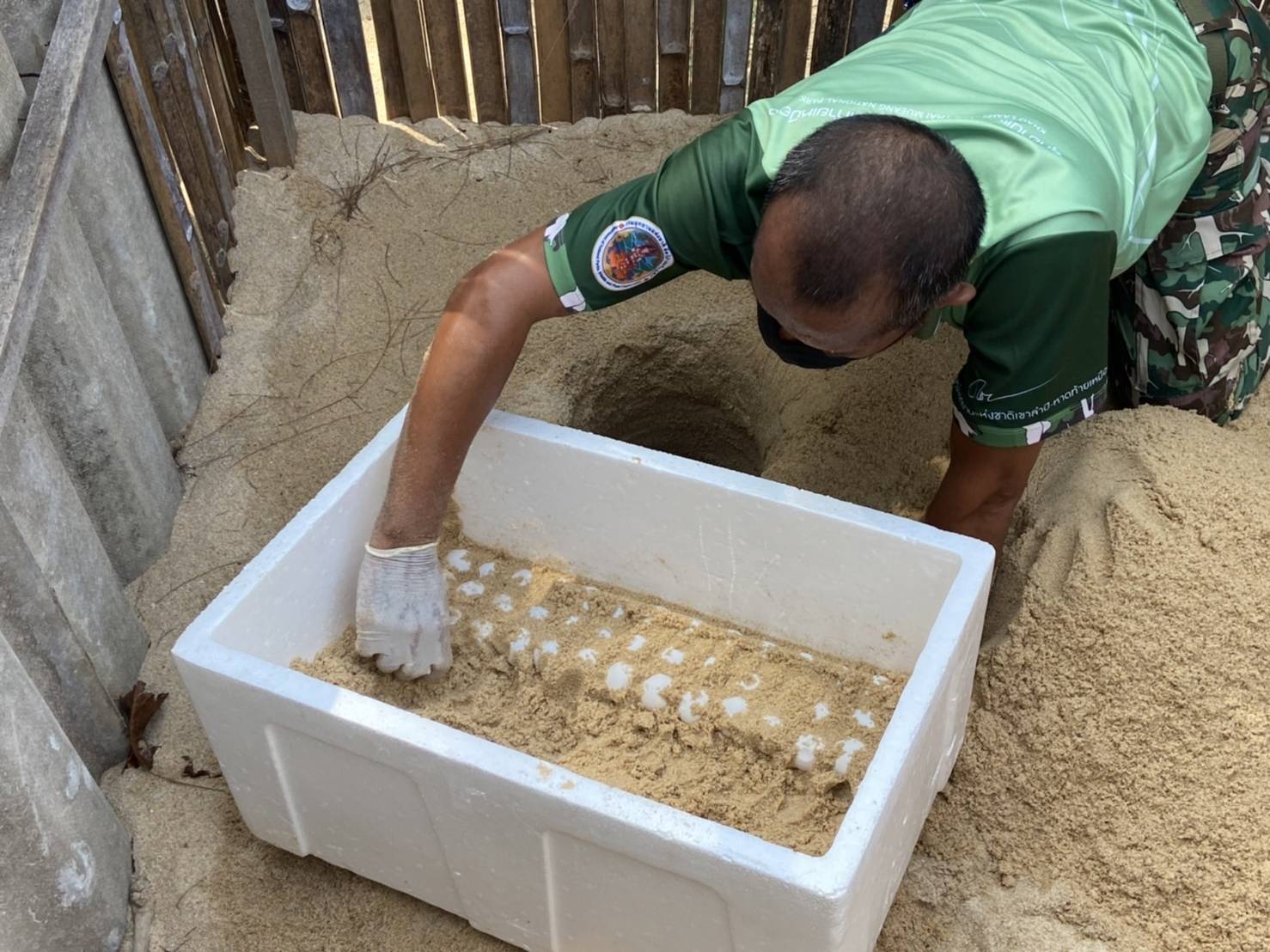 เจ้าหน้าที่วัดขนาดรอยของแม่เต่าที่พบได้แก่ ความกว้างจากพายซ้าย-ขวา 100 ซม. ความกว้างช่วงอก 30 ซม. คาดว่า เป็นเต่าเล็ก แต่ยังไม่สามารถระบุชนิดได้ จากนั้นได้ค้นหาจนพบไข่และพิจารณาแล้วพบว่า บริเวณหลุมไข่ที่แม่เต่าวางไว้มีโอกาสที่น้ำทะเลท่วมถึงและเสี่ยงจากภัยธรรมชาติอื่นๆ ที่จะทำให้ไข่เต่าเกิดความเสียหายได้ จึงย้ายไข่ทั้งหมดมาฟักบริเวณชายหาดหน้าศูนย์บริการนักท่องเที่ยวภายในคอกเดียวกันกับการฟักไข่ของเต่าทะเลรังที่ 1 และรังที่ 2 ที่ผ่านมา พบไข่ทั้งหมด 59 ฟอง ไข่ดี 56 ฟอง และไข่ลม 3 ฟอง จากนี้จะปล่อยให้ไข่เต่าได้ฟักตัวตามธรรมชาติจนกว่าจะฟักออกเป็นตัวซึ่งคาดว่าจะใช้ระยะเวลาในการฟัก 55-60 วัน.-สำนักข่าวไทย