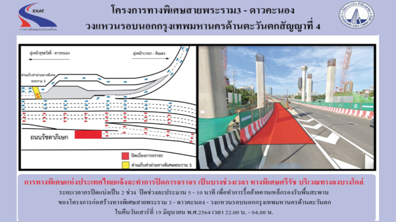 การทางพิเศษแห่งประเทศไทย (กทพ.) กระทรวงคมนาคม ได้ว่าจ้างบริษัท ช.การช่าง จํากัด (มหาชน) ผู้ดําเนินการก่อสร้าง โครงการทางพิเศษสายพระราม 3 – ดาวคะนอง – วงแหวนรอบนอกกรุงเทพมหานคร ด้านตะวันตก สัญญาที่ 4 จะดำเนินการปิดเบี่ยงจราจรบริเวณทางพิเศษศรีรัช ช่วงทางลงบางโคล่ เพื่อทำการรื้อย้ายคานเหล็กรับพื้นสะพาน ในวันเสาร์ที่ 19 มิถุนายน พ.ศ.2564 จึงจำเป็นจะต้องปิดการจราจรเป็นบางช่วงเวลา ระยะเวลาการปิดแบ่งเป็น 2 ช่วง ปิดช่วงละประมาณ 5-10 นาที ตั้งแต่เวลา 22.00 น. – 04.00 น.