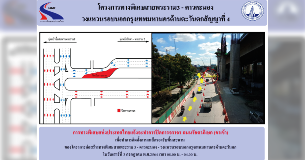 การทางพิเศษแห่งประเทศไทย (กทพ.) กระทรวงคมนาคม ได้ว่าจ้างบริษัท ช.การช่าง จํากัด (มหาชน) ผู้ดําเนินการก่อสร้าง โครงการทางพิเศษสายพระราม 3 – ดาวคะนอง – วงแหวนรอบนอกกรุงเทพมหานคร ด้านตะวันตก สัญญาที่ 4 จะดำเนินการปิดเบี่ยงจราจรบนถนนรัชดาภิเษก (ขาเข้า) เพื่อทำการติดตั้งคานเหล็กรับรองรับพื้นสะพาน ในวันเสาร์ที่ 3 กรกฎาคม พ.ศ. 2564 จึงจำเป็นจะต้องปิดการจราจร ตั้งแต่เวลา 08.00 น. – 04.00 น.