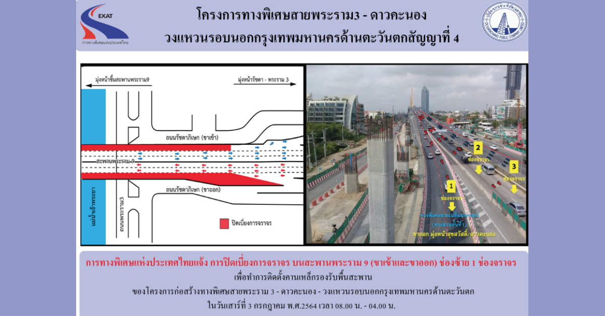 การทางพิเศษแห่งประเทศไทย (กทพ.) กระทรวงคมนาคม ได้ว่าจ้างบริษัท ช.การช่าง จํากัด (มหาชน) ผู้ดําเนินการก่อสร้าง โครงการทางพิเศษสายพระราม 3 – ดาวคะนอง – วงแหวนรอบนอกกรุงเทพมหานคร ด้านตะวันตก สัญญาที่ 4 จะดำเนินการปิดเบี่ยงจราจรบนสะพานพระราม 9 (ขาเข้าและขาออก) ช่องทางซ้าย 1 ช่องจราจร เพื่อทำการติดตั้งคานเหล็กรองรับพื้นสะพาน ในวันเสาร์ที่ 3 กรกฎาคม พ.ศ.2564 จึงจำเป็นจะต้องปิดการจราจร ตั้งแต่เวลา 08.00 น. – 04.00 น. ทั้งนี้ กทพ. ได้มีการติดตั้งป้ายเตือนก่อนถึงพื้นที่ดําเนินการ และติดตั้ง ไฟสัญญาณต่างๆ ป้ายประชาสัมพันธ์การเบี่ยงการจราจรพร้อมไฟวับวาบ เพื่อให้สัญญาณแก่ผู้ใช้ทางพิเศษทราบ