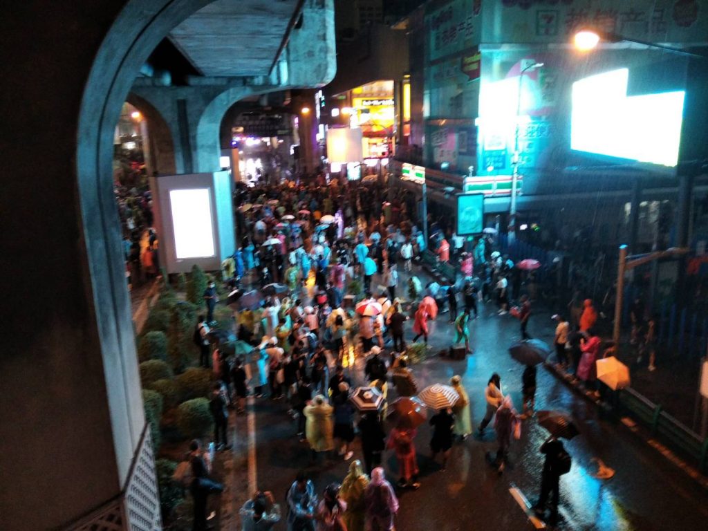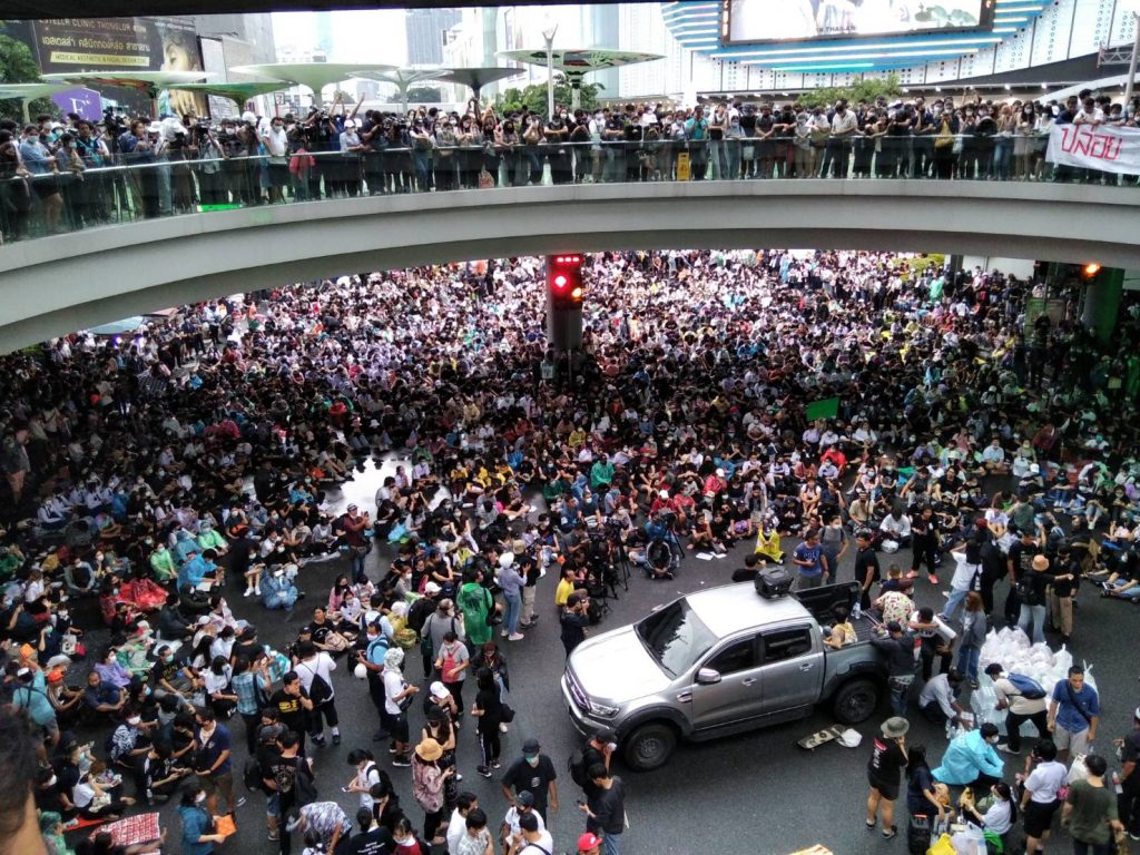 จากแยกเฉลิมเผ่าถึงแยกปทุมวันระยะทาง 800 เมตร เดินบนทางเดินเท้าไปเรื่อยๆ ถึงแยกปทุมวัน ซึ่วผู้ชุมนุมเต็มพื้นที่สี่แยกแล้วอย่างรวดเร็ว และล้นออกตามถนนสี่ด้านไปอีกมาก ส่วนบนสกายวอล์กเต็มไปด้วยผู้ชุมนุมเช่นกัน