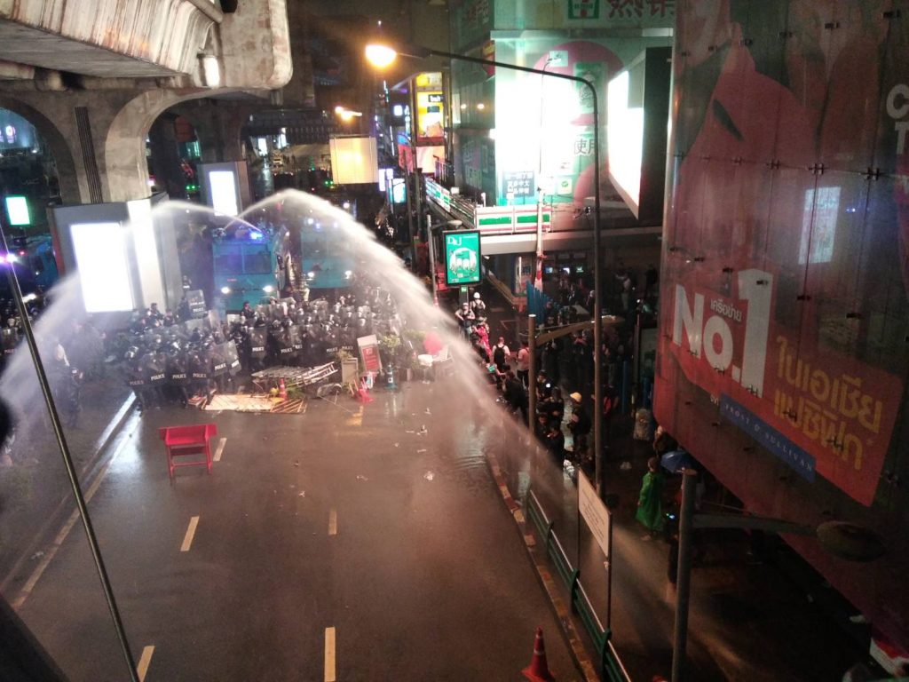 ตำรวจควบคุมฝูงชนขยับจากแยกเฉลิมเผ่าเข้ามาใกล้เรื่อยๆ เสียงกระบองเคาะโล่เกราะข่มขวัญผู้ชุมนุม น้ำแรงดันสูงถูกฉีดออกมาเป็นระยะ นานๆ ครั้ง มีเสียงเครื่องยิงแก๊สน้ำตาดังขึ้น ผู้ชุมนุมชายนำรั้วเหล็ก กระถางดอกไม้ไปทำแนวกั้น และเข้าผลักดันตำรวจ แต่มิอาจต้านทานได้