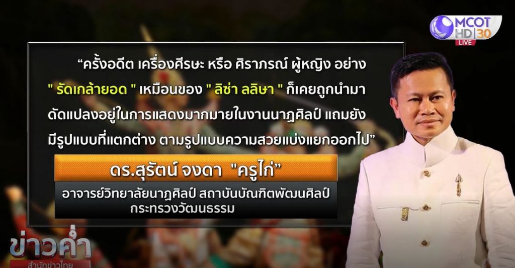 ครูไก่ หรือ ดร.สุรัตน์ จงดา อาจารย์วิทยาลัยนาฏศิลป์ สถาบันบัณฑิตพัฒนศิลป์ กระทรวงวัฒนธรรม ออกมาอธิบายว่า นั่น ไม่ใช่ชฎา แต่คือรัดเกล้ายอด เป็นเครื่องศีรษะ หรือศิราภรณ์ผู้หญิง เคยถูกนำมาดัดแปลงอยู่ในการแสดงมากมายในงานนาฏศิลป์ แถมยังมีรูปแบบที่แตกต่าง ตามรูปแบบความสวยแบ่งแยกออกไปด้วย อาทิ บางชิ้นงานมีดอกไม้ต่างประกอบ หรือมีการประดับเพชร