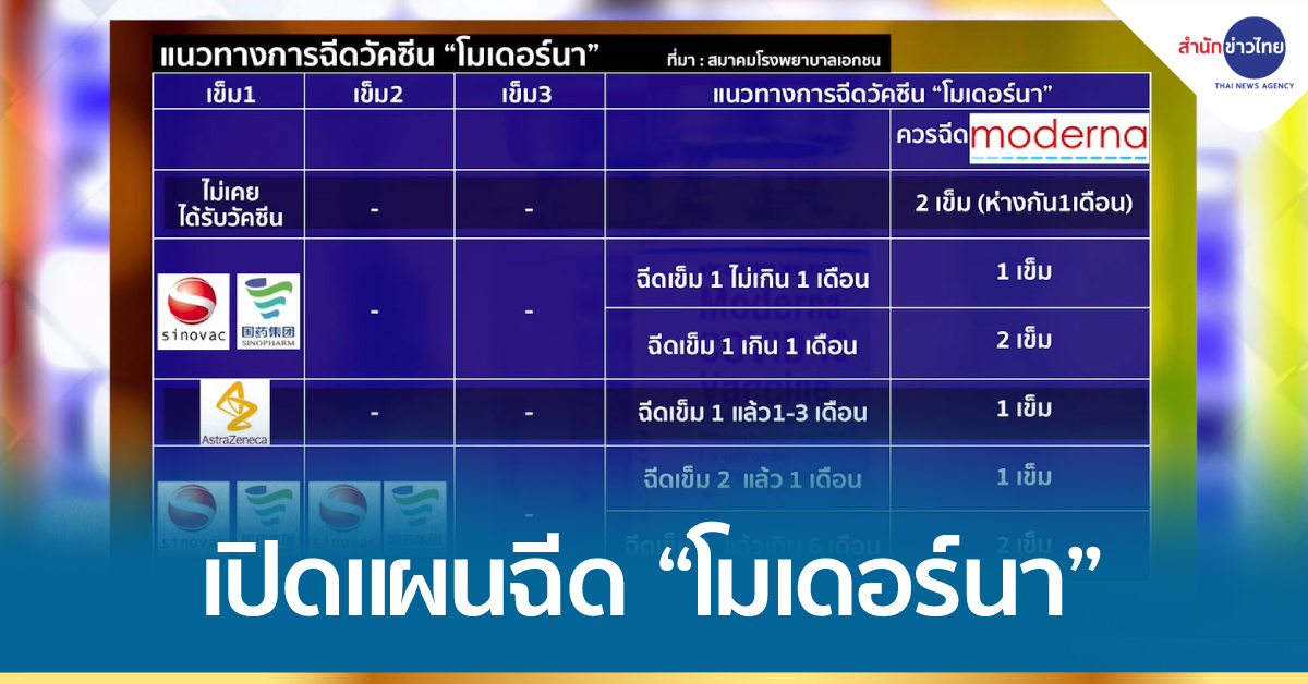 อสมท 22 ก.ย.-เปิดแผนเตรียมฉีดวัคซีน “โมเดอร์นา” ที่ประชาชนเสียเงินจองเอง ที่จะนำเข้ามาช่วงกลางเดือน ต.ค.นี้ ผ่านโควตาของสมาคม รพ.เอกชน และสภากาชาดไทย พร้อมแนะวิธีการฉีดอย่างปลอดภัย สำหรับคนที่เคยฉีดวัคซีนชนิดอื่นๆ มาก่อนแล้ว .-สำนักข่าวไทย