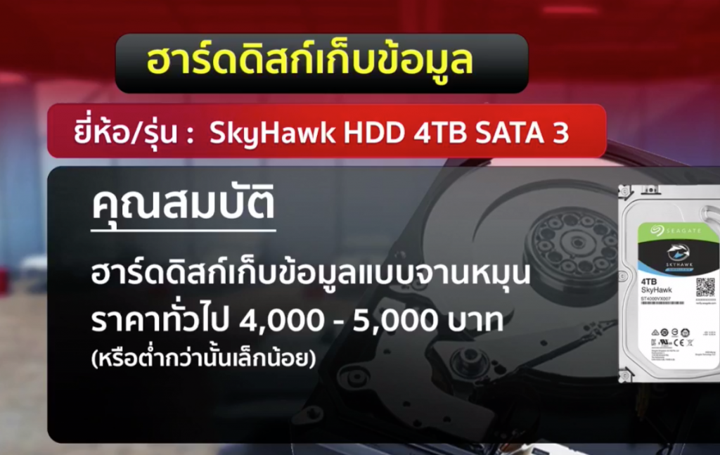 นอกจากนี้ในหนังสือใบส่งของ พบราคาฮาร์ดดิสก์ที่ใช้เก็บข้อมูล ราคาลูกละ 9,900 บาท ยี่ห้อ SkyHawk ขนาด 4 เทราไบต์ (เป็น HDD ไม่ใช่ SSD) และสั่งซื้อจำนวน 28 ลูก รวมเป็นเงิน 277,200 บาท ซึ่งส่วนใหญ่ราคาตามท้องตลาดจะอยู่ที่ลูกละไม่เกิน 4,000 – 5,000 บาท อีกข้อมูลที่น่าสนใจคือ ค่าแรงติดตั้งกล้องวงจรปิดทั้งหมด 113 จุด พบว่ามีราคาจุดละ 3,000 บาท รวมค่าแรงติดตั้งอยู่ที่ 339,000 บาท